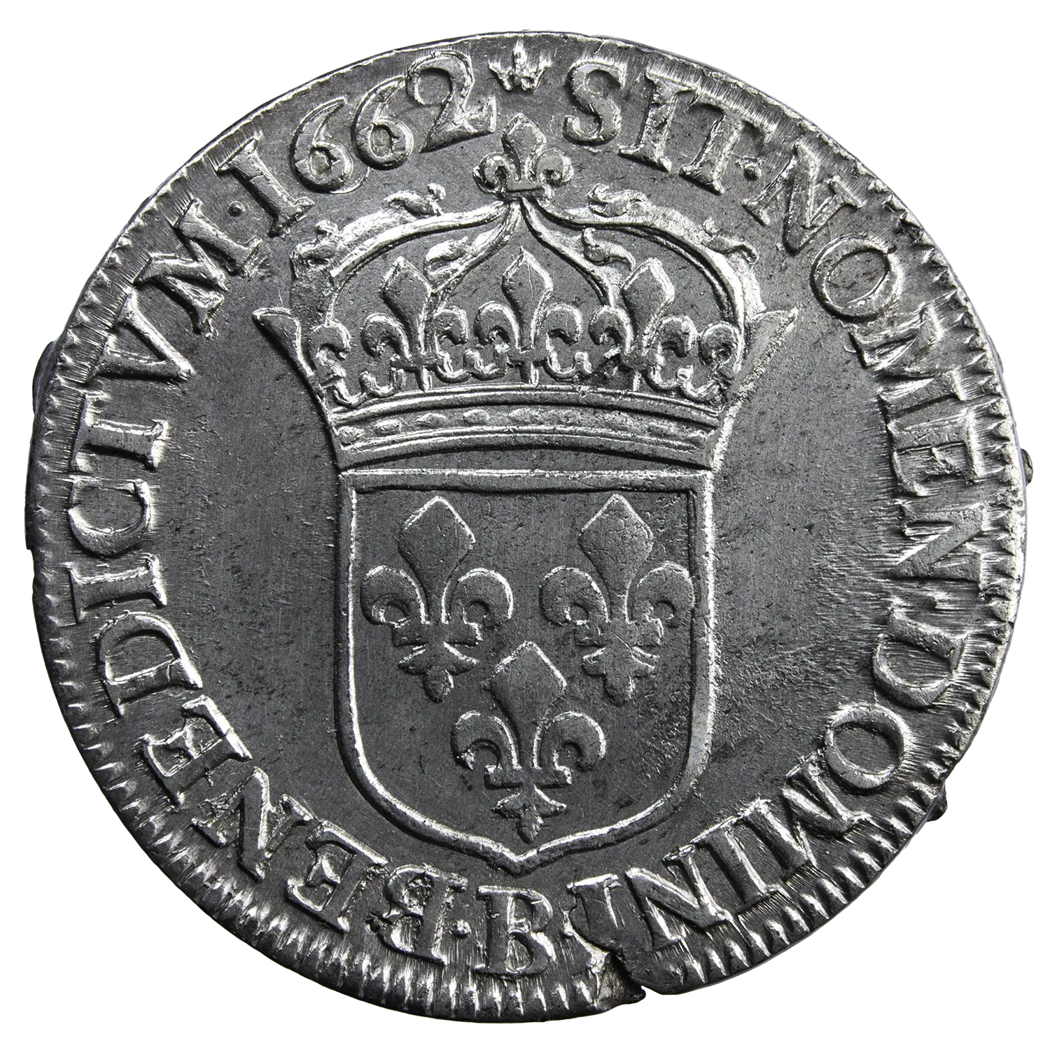 Demi-écu au buste juvénile de Louis XIV, frappé en 1662 à Rouen lettre d’atelier B. Monnaie de belle qualité ayant subi un nettoyage.