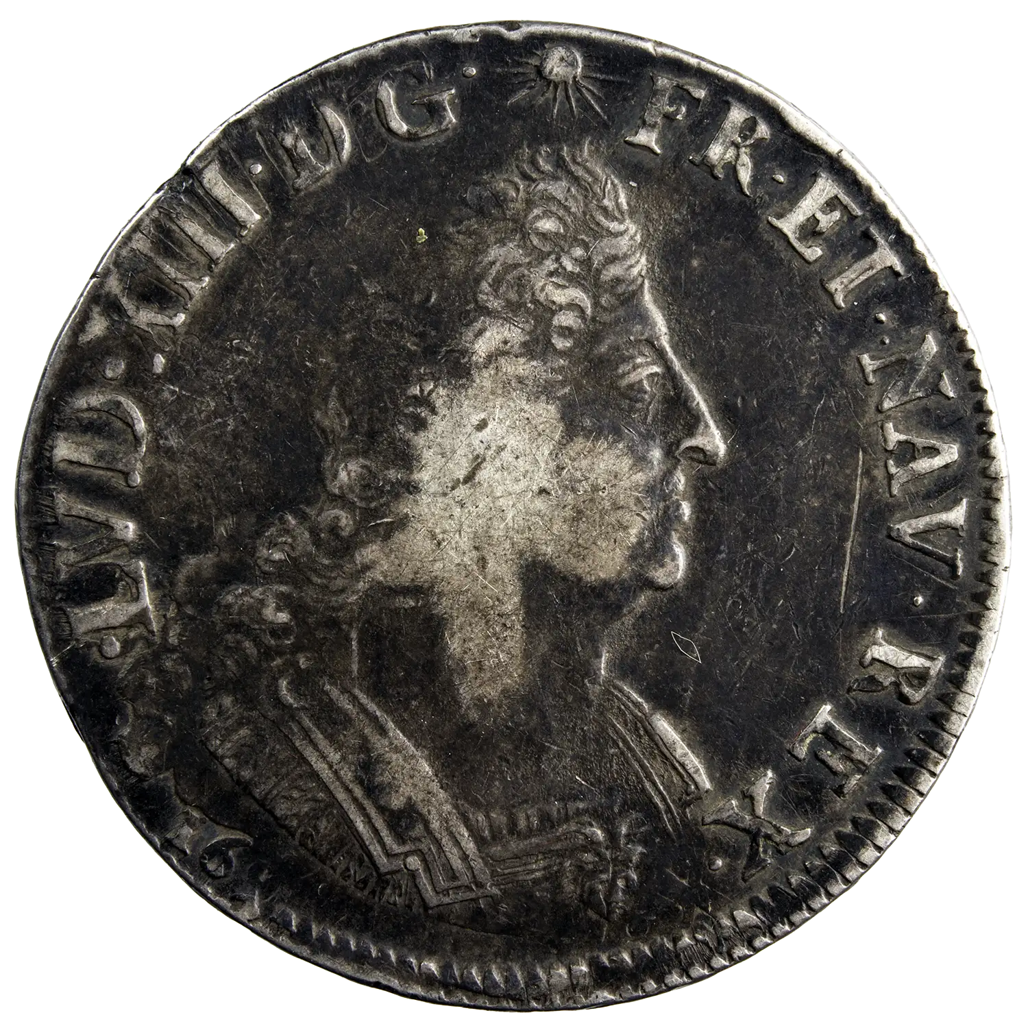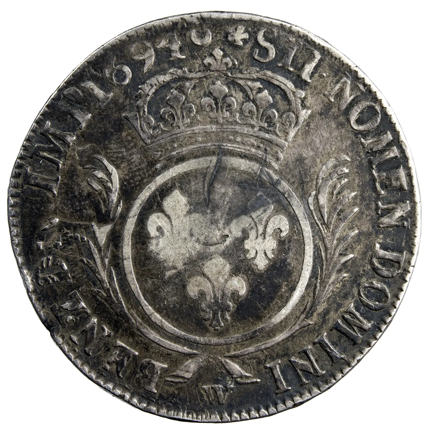 Réformation de l’écu au palmes de Louis XIV, monnaie frappée à Lille en 1694. Exemplaire intéressant du fait de l’erreur dans la légende en effet il n’y a que trois I au lieu de 4 pour le nom du roi roi LVD. XIII