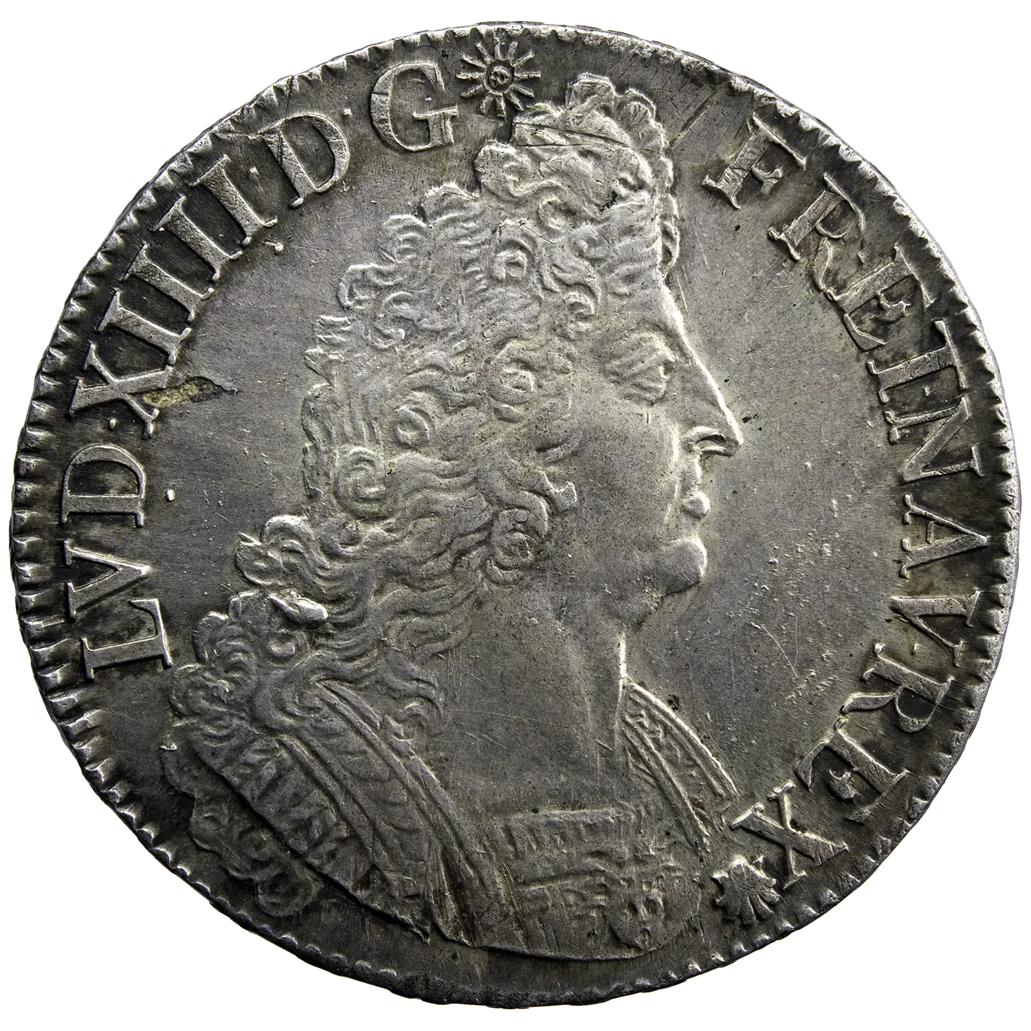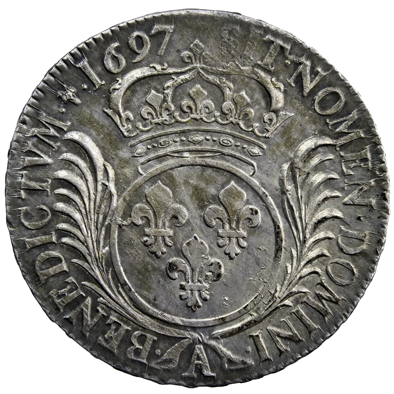 Écu aux palmes de Louis XIV, monnaie frappée à Paris en 1697 (second semestre), avec le second poinçon de buste. Léger défaut de métal du flan à l’avers, situé à 9 heures.