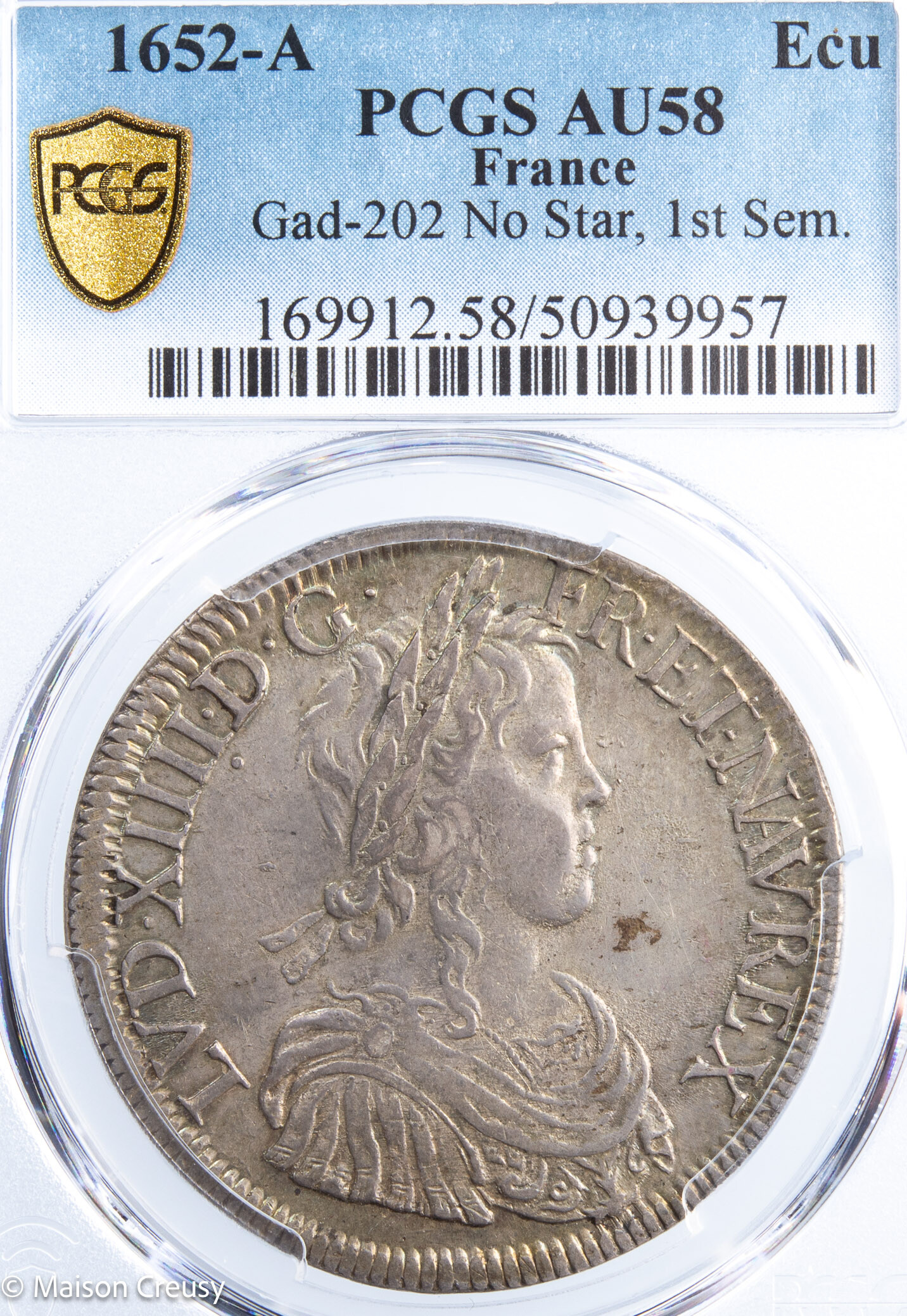 Superbe écu de LOUIS XIV roi de France; type dit à la mèche longue, frappé en 1652 à Paris. Monnaie certifiée par PCGS AU58 (About Uncirculated). De très belle qualité avec une jolie patine.