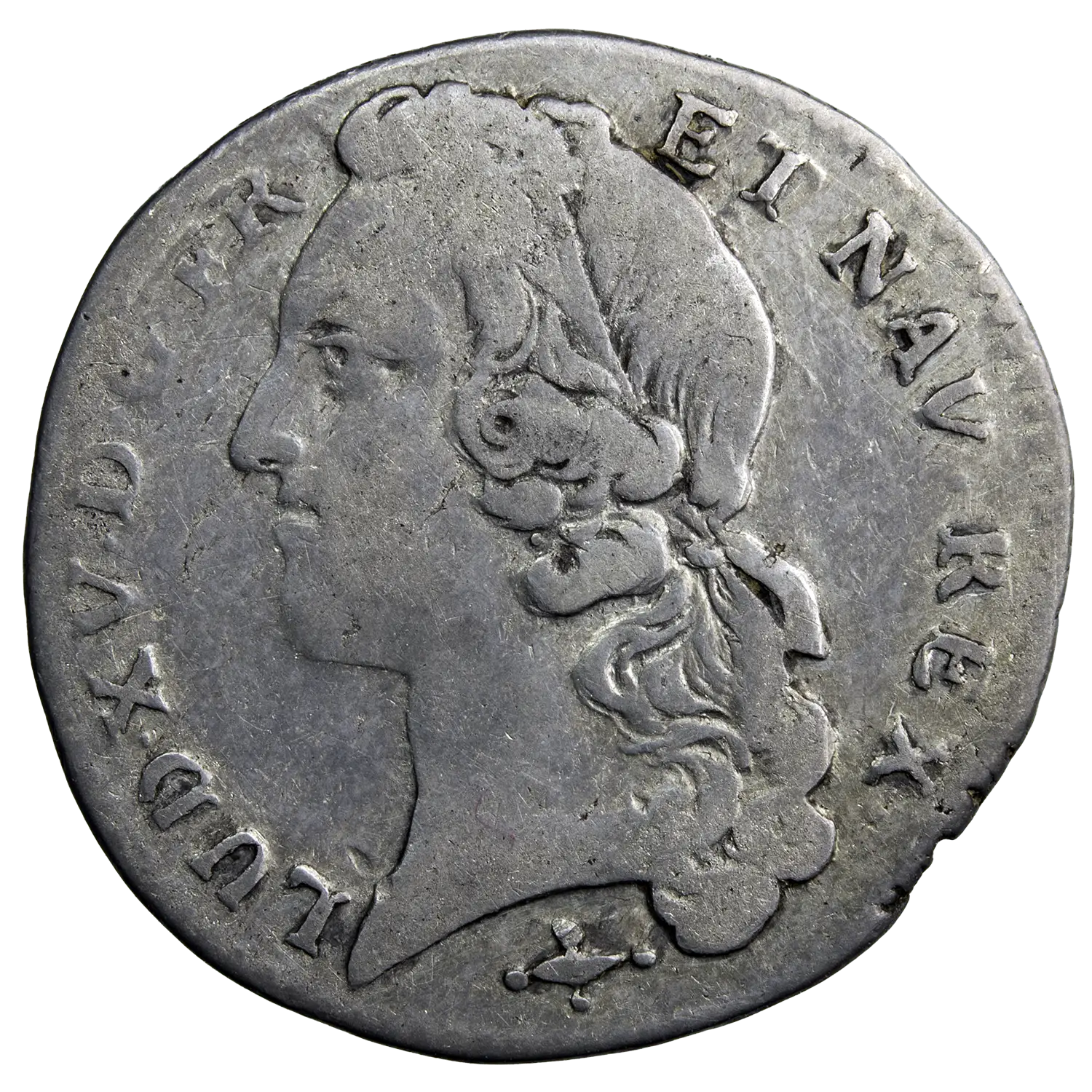 Cinquième d’écu en argent de Louis XV roi de France, monnaie frappée en 1749 à Lyon lettre d’atelier D. Classé R2 dans le Clairand.