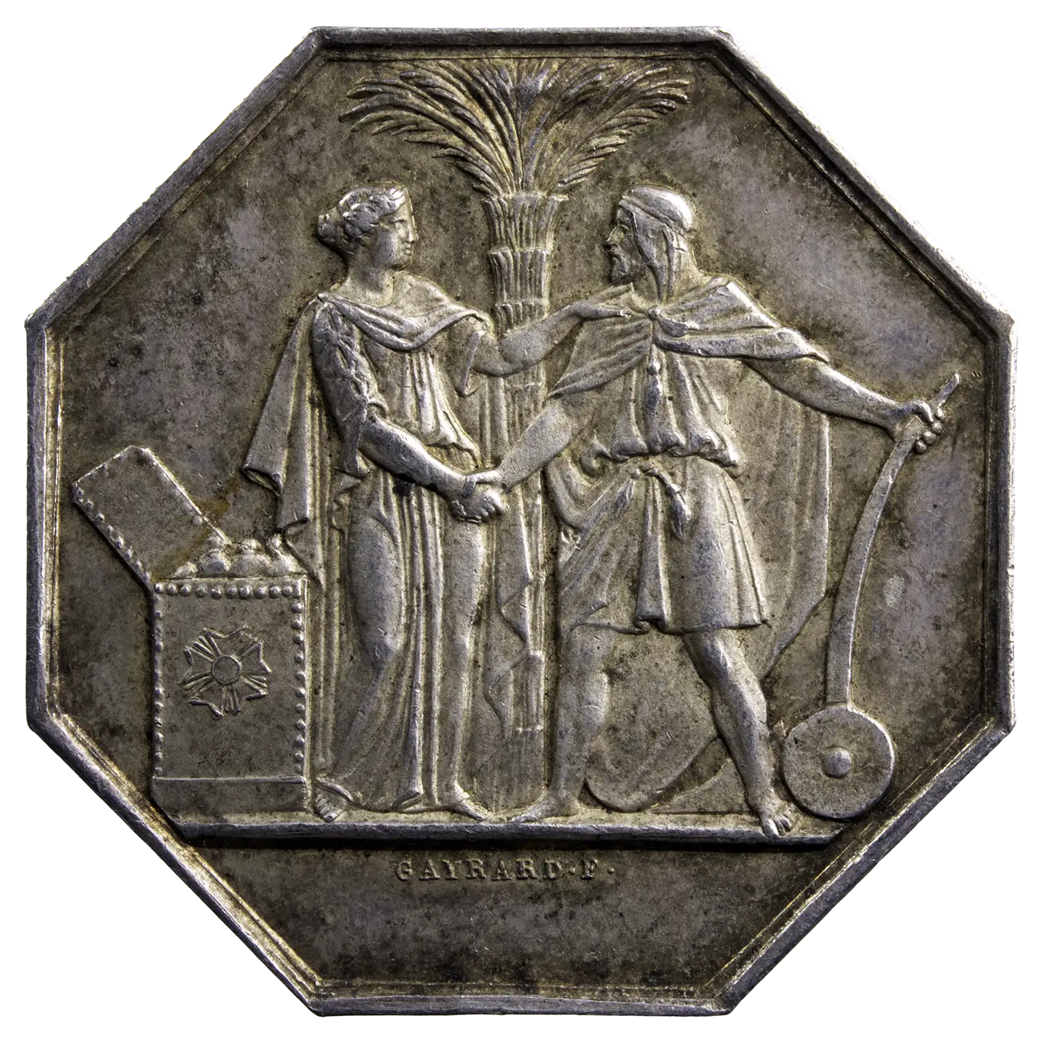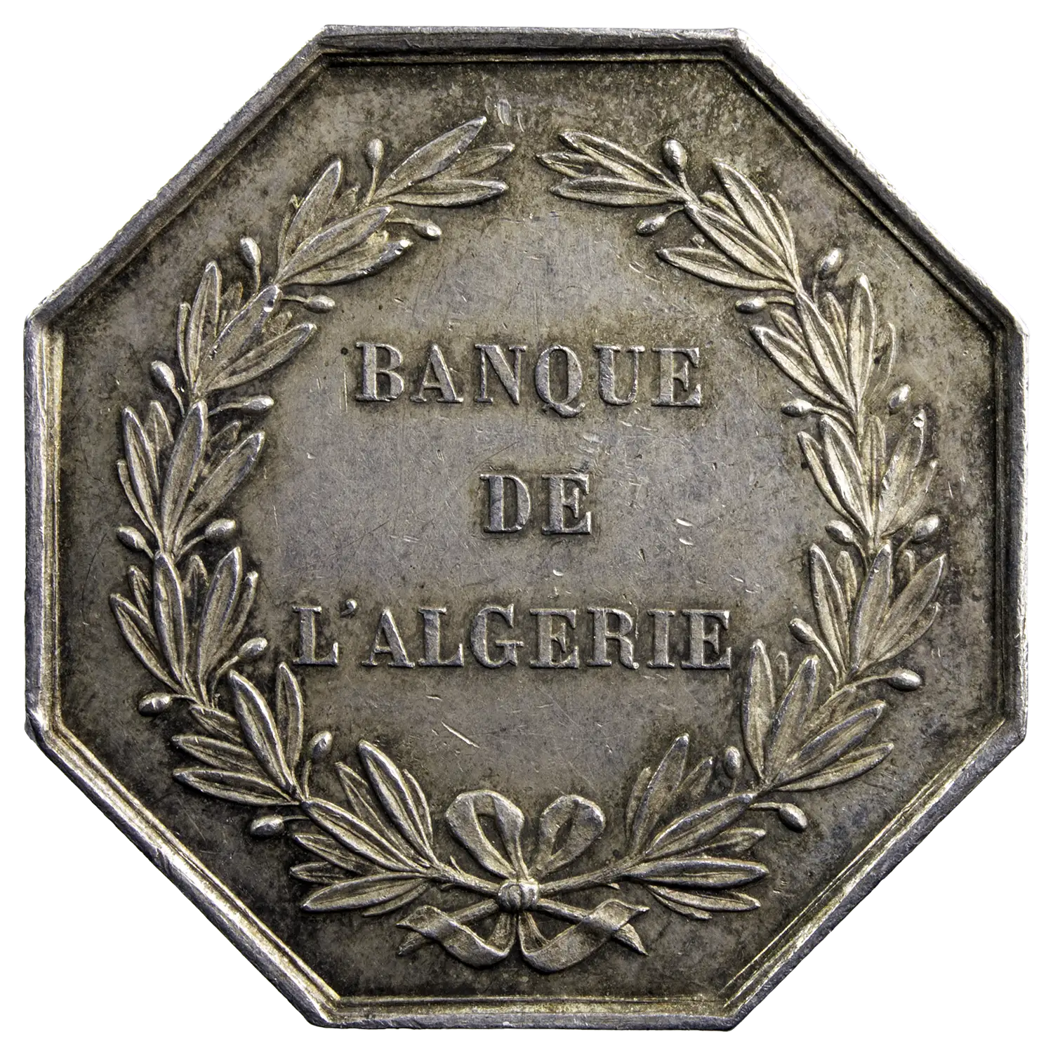 Jeton octogonal en argent frappé pour la banque de l’Algérie vers 1845-1860 à Paris. La loi comportant la création de la Banque de l’Algérie fut promulguée le 19 août 1851