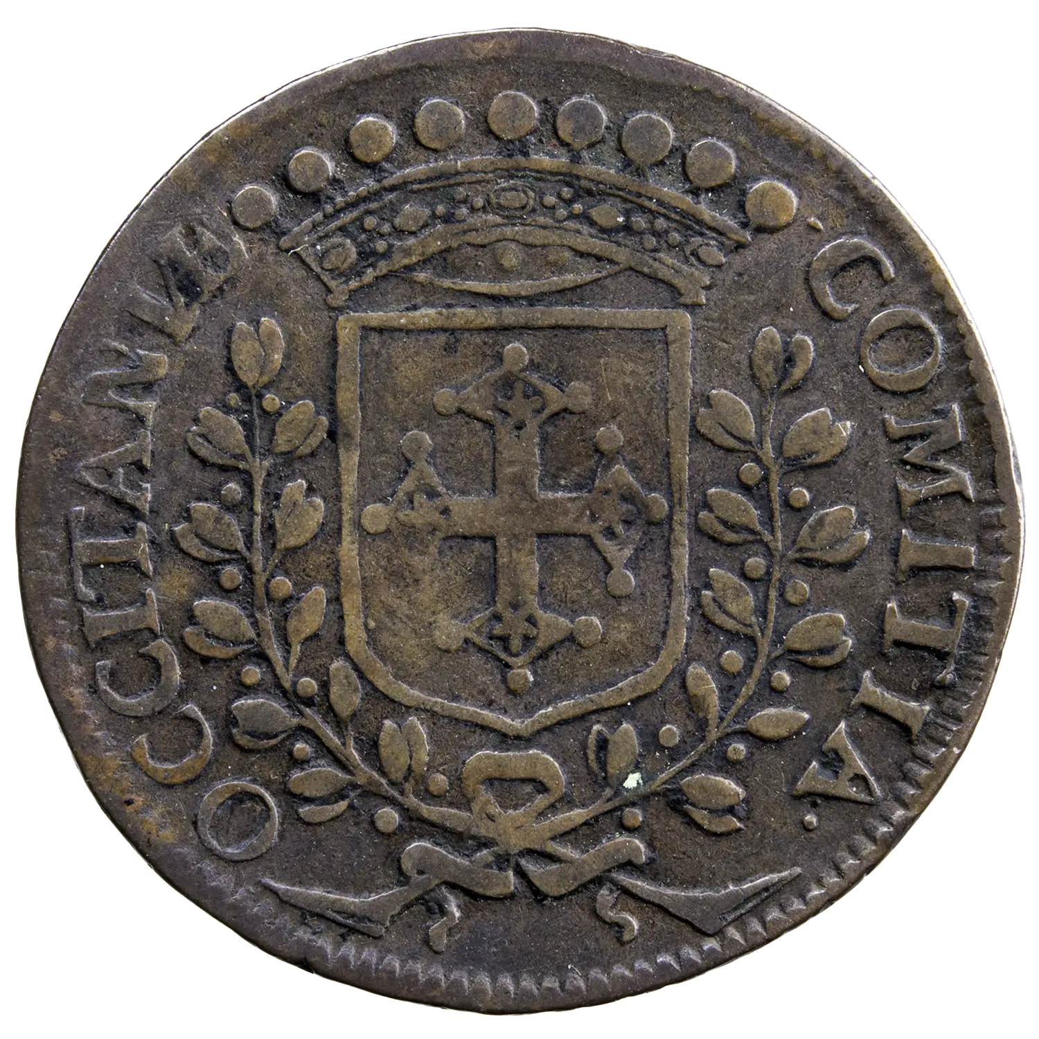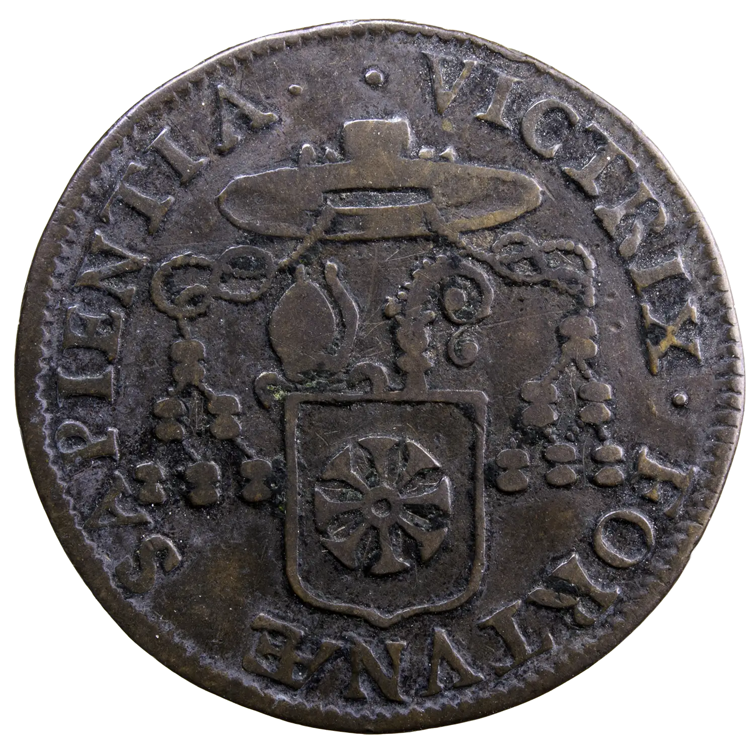 Jeton en cuivre des états du Languedoc avec les armes de Pierre Bonzi, évêque de Beziers. Jeton légèrement concave frappé en 1657.