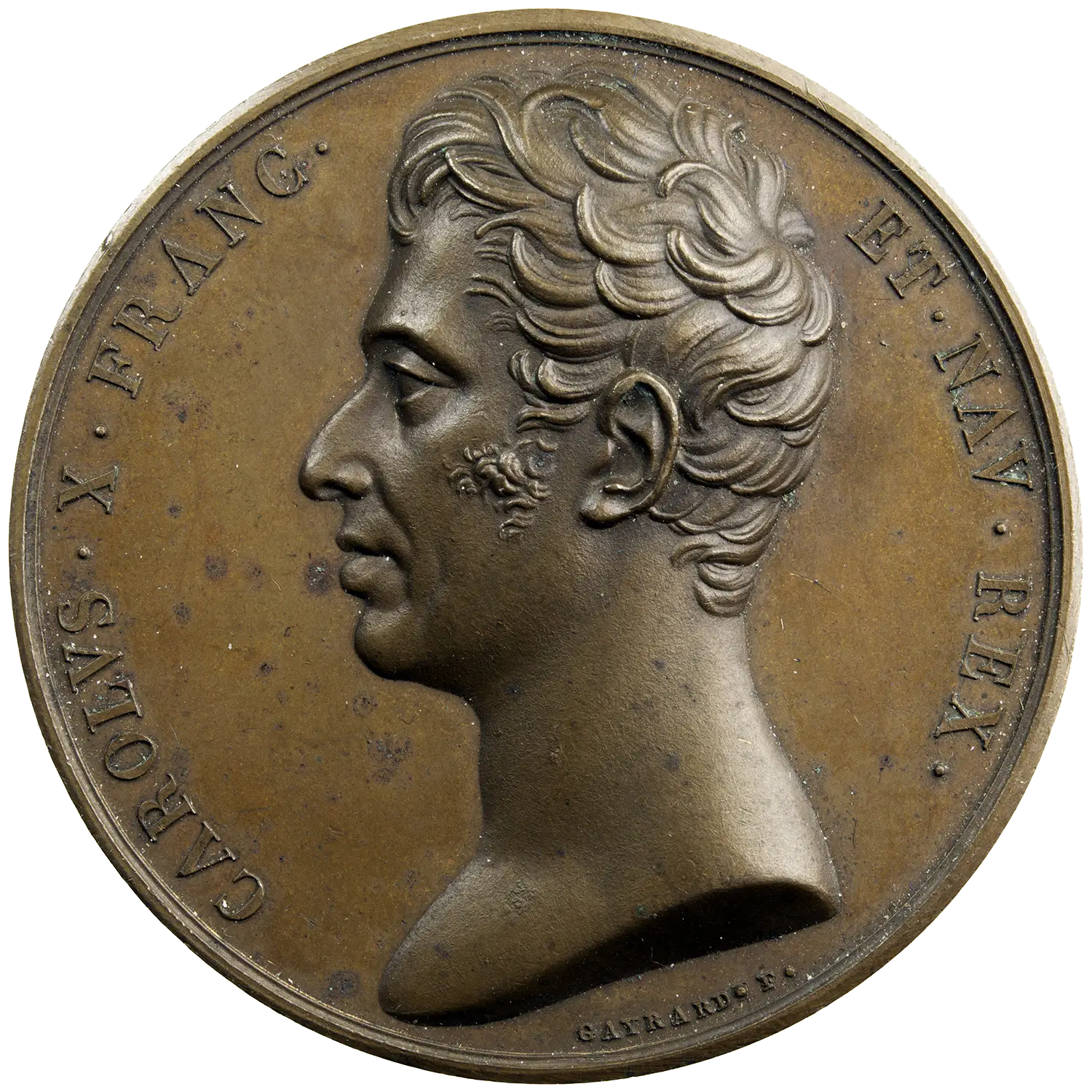 Belle médaille en bronze, pour l’avénement de Charles X au trône le 16 septembre 1824, gravée par Raymond Gayrard. Tranche lisse sans poinçon.