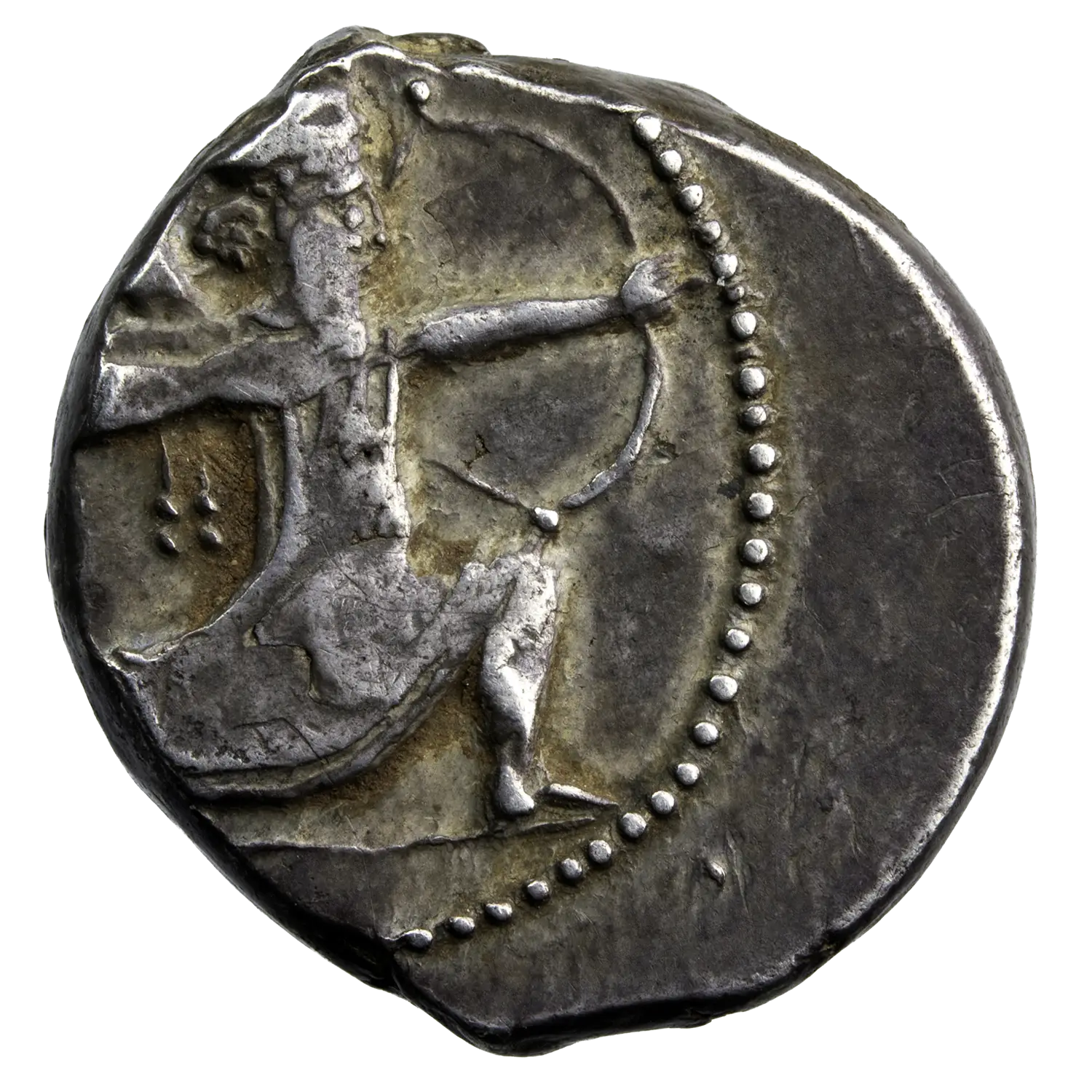 Coin struck for the Achaemenid Kingdom under Artaxerxes II or III, around 400–341 BC. The obverse shows the king kneeling and holding a bow, and the reverse depicts a horseman to the right with a dolphin below.
