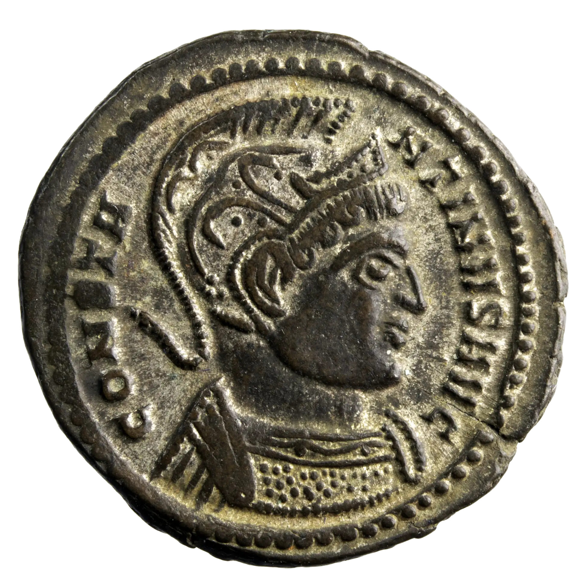 Follis of the Roman emperor Constantine I, called the Great, coin struck in Trier around 322–323. Very well-centered coin