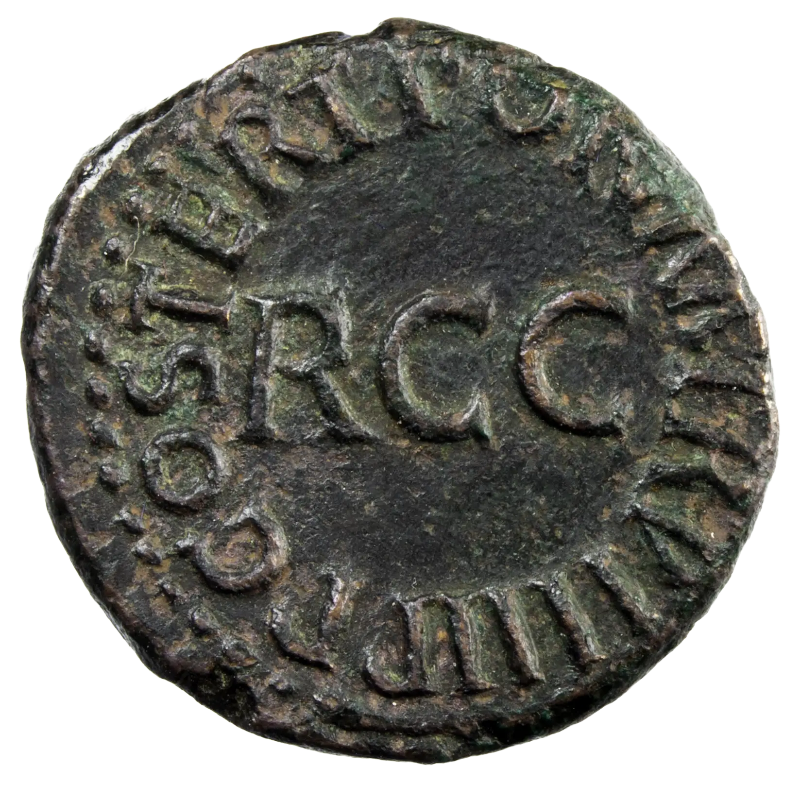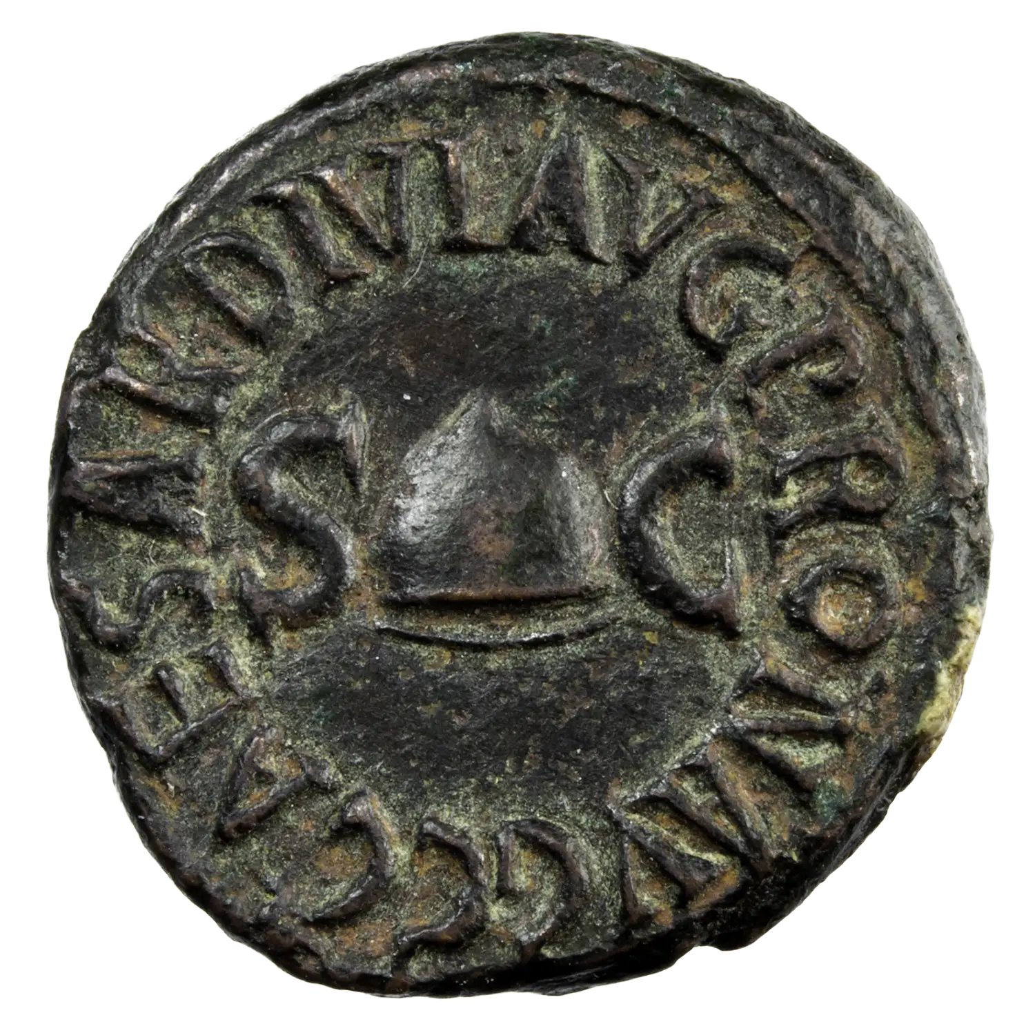 Small bronze quadrans of the Roman Emperor Caligula, coin struck in Rome in AD 40. Obverse: pileus (cap of liberty); reverse: RCC.