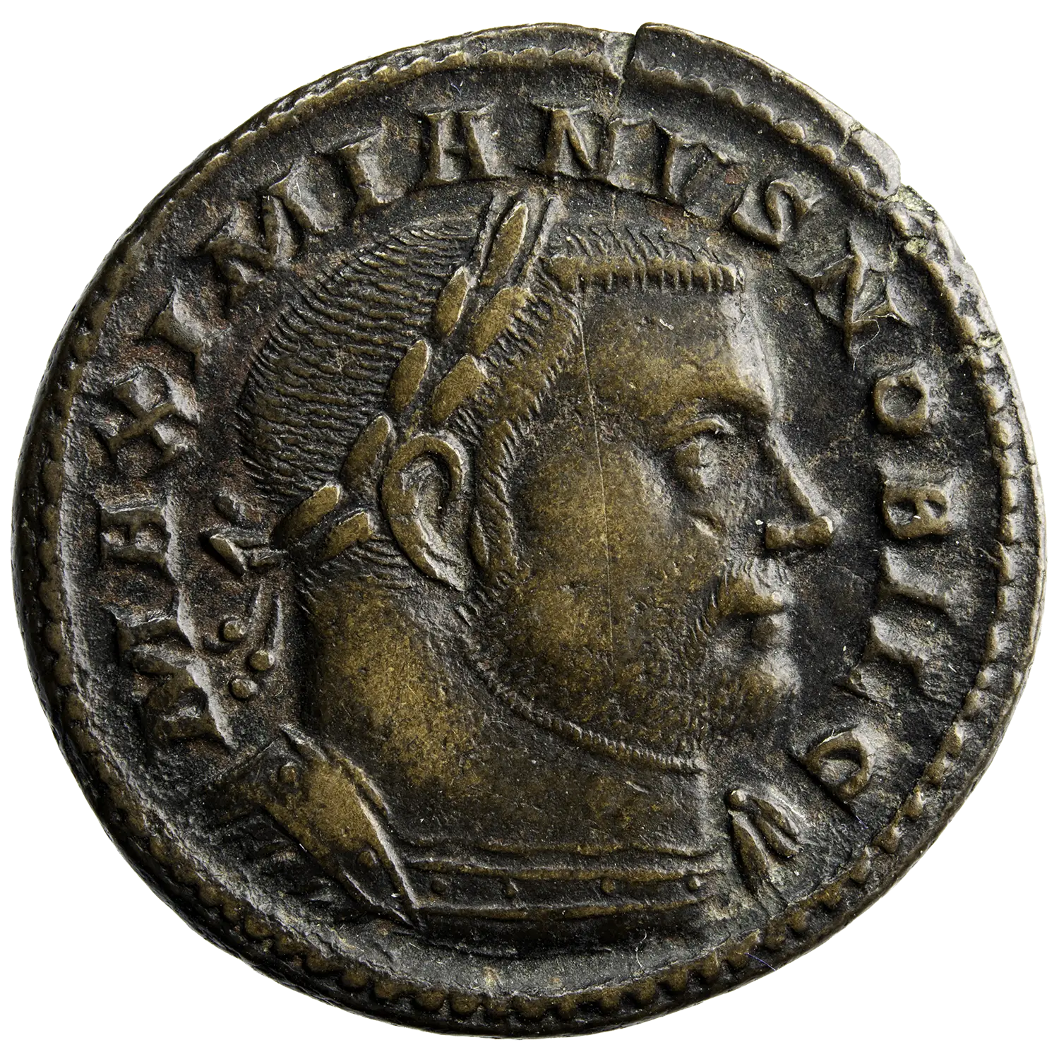 Bronze follis of the Roman emperor Galerius Maximian, struck in Trier around AD 303–305. Roman Genius depicted on the reverse.