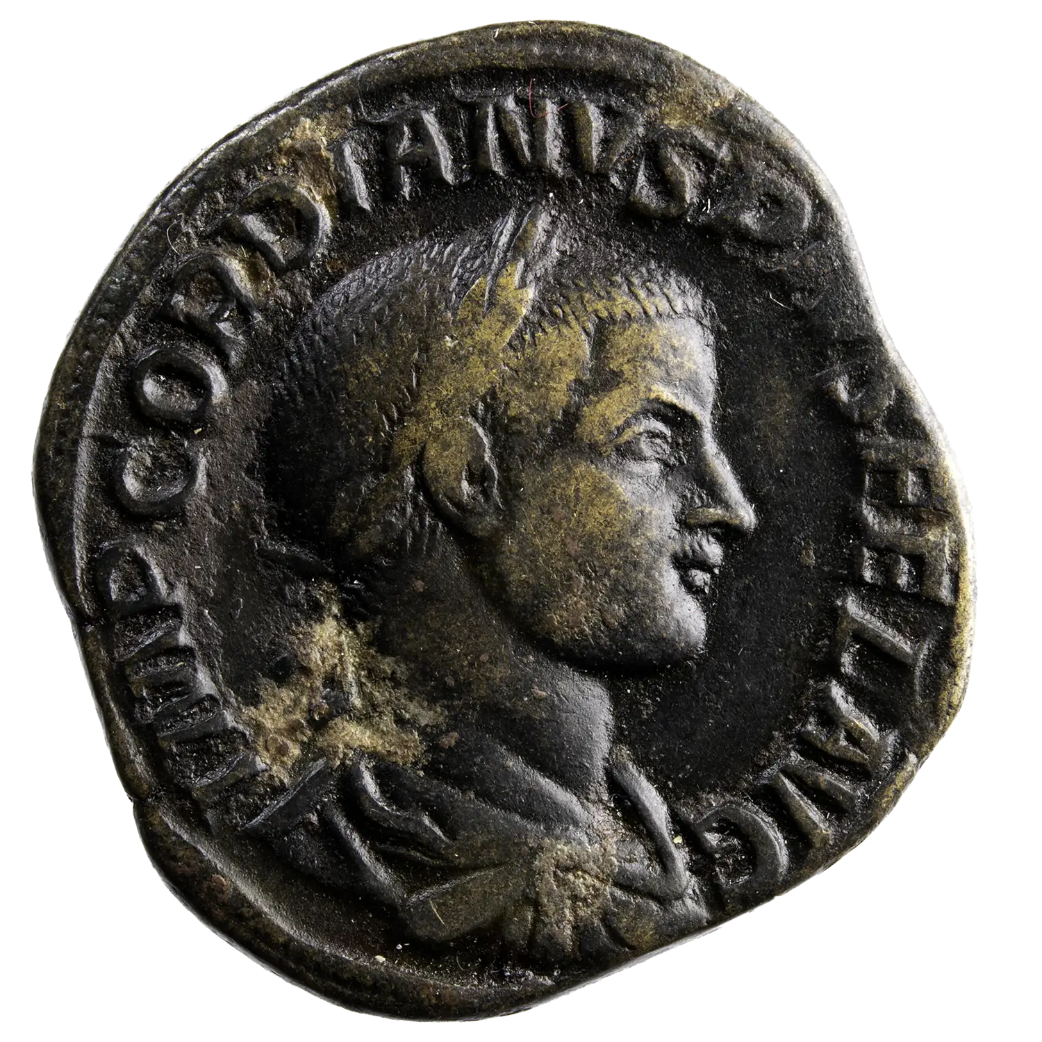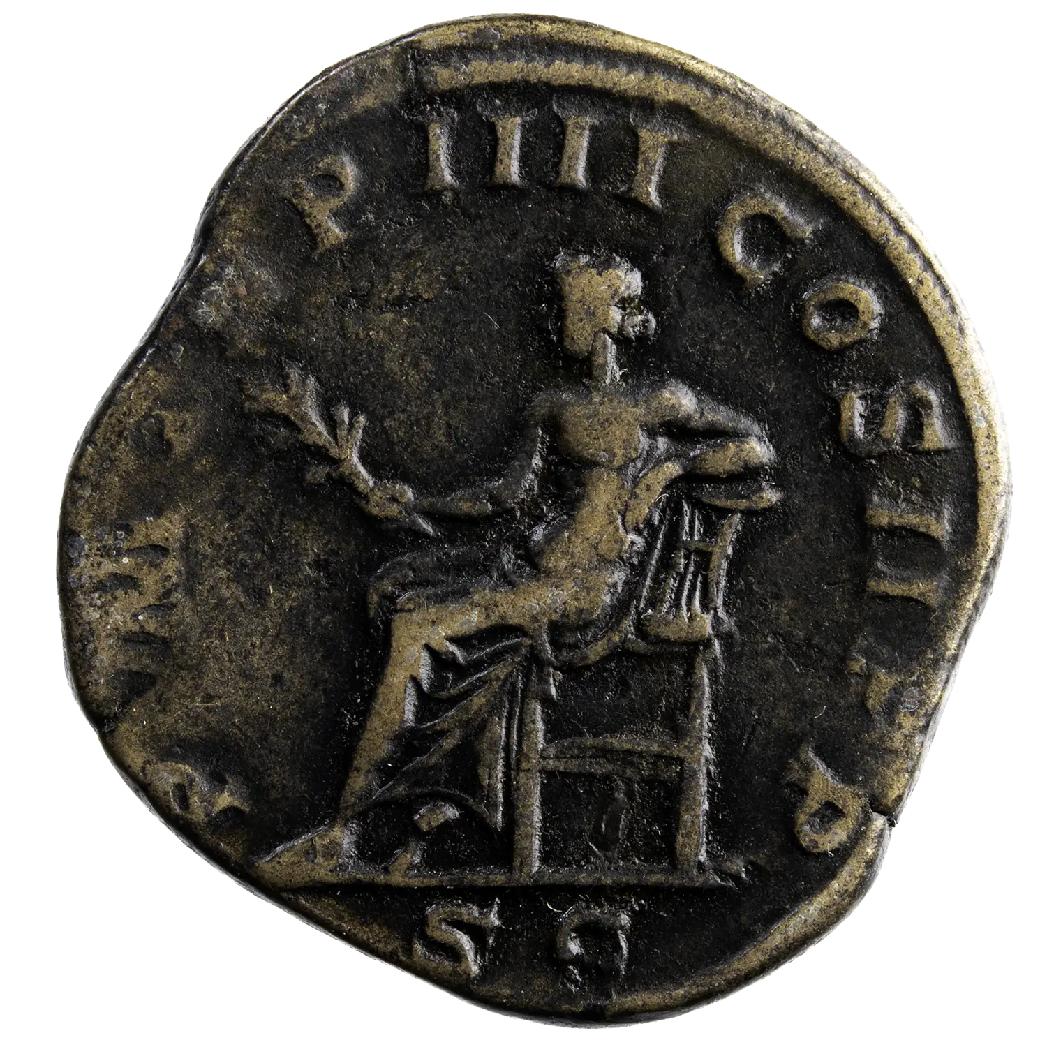 Bronze sestertius of the Roman Emperor Gordian III, coin struck at Rome in 241. Apollo seated left, holding a laurel branch and resting on a lyre