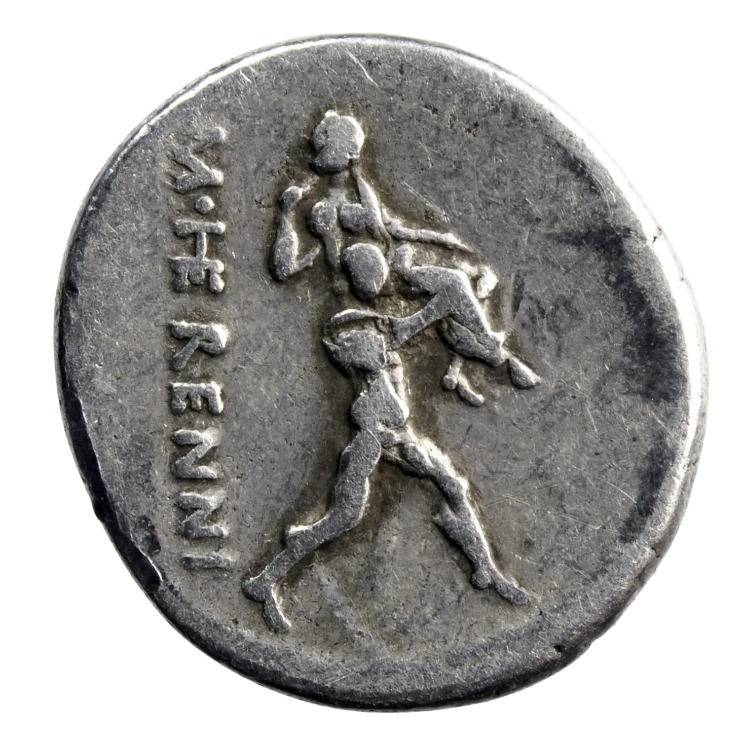 Denarius of the Roman Republic struck in 108–107 BC by M. Herennius, a Roman monetary magistrate and a member of the gens Herennia, a plebeian family of Rome.