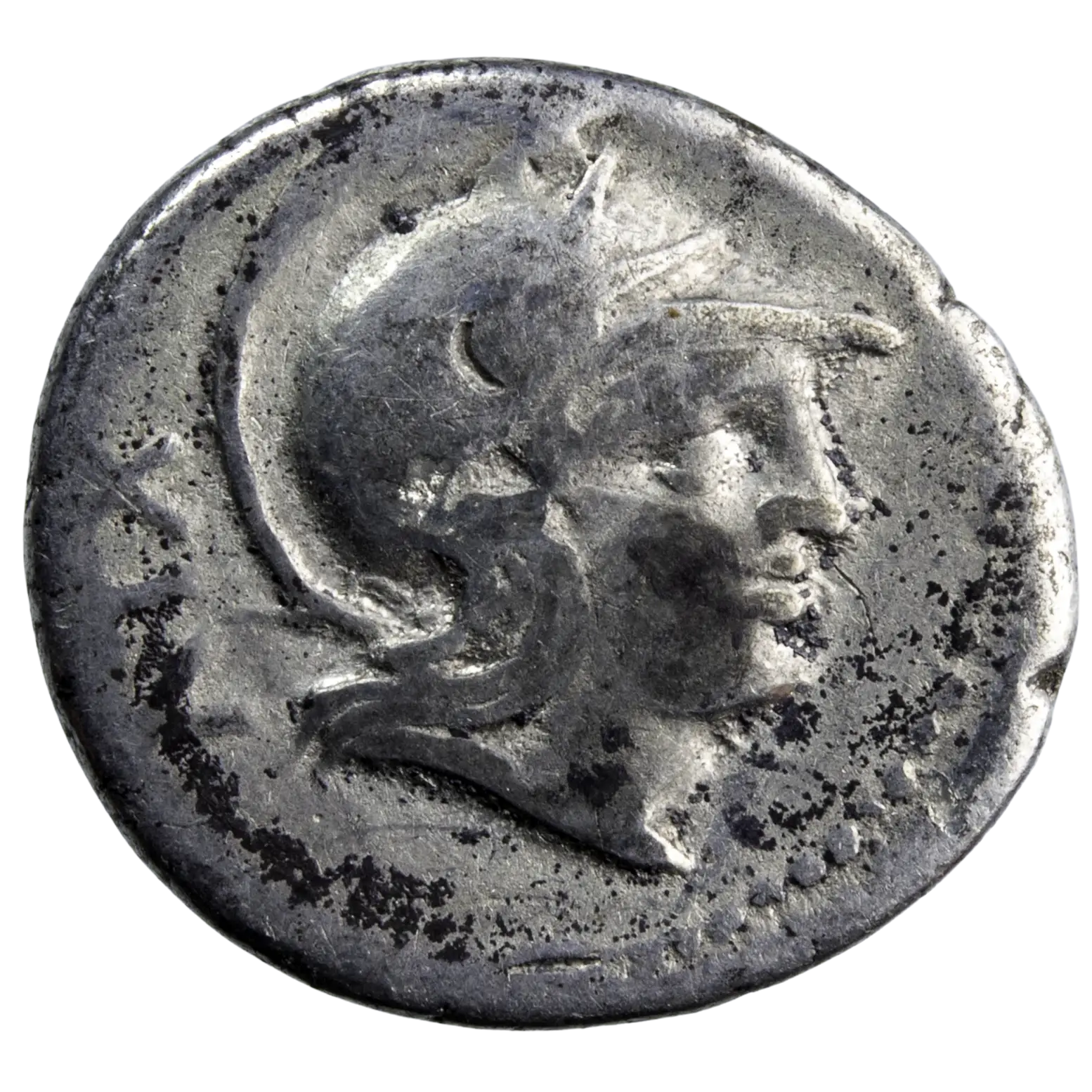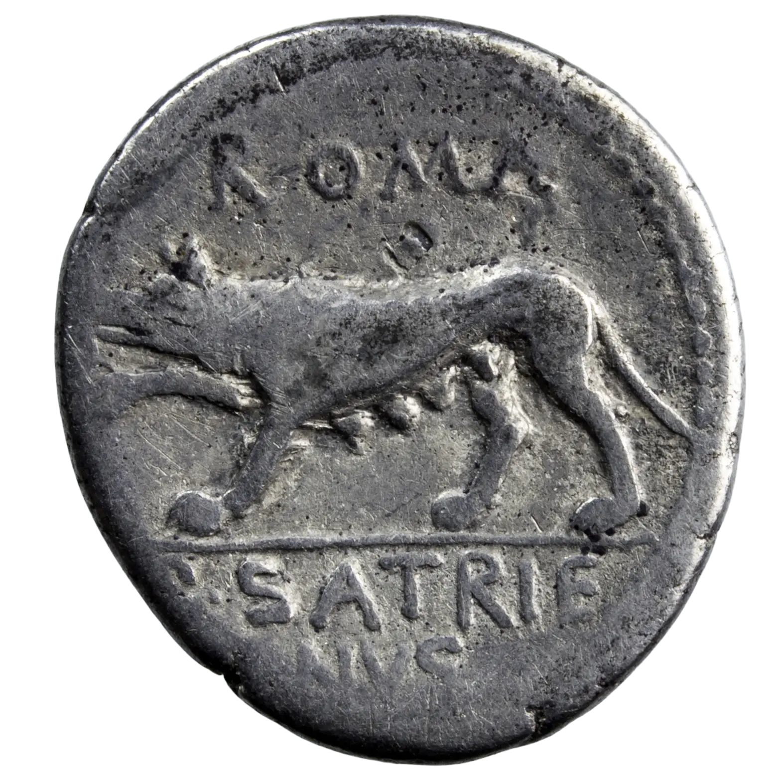 Denier en argent de la république romaine, frappé sous la famille Satriena en 77 avant JC. Tête de Mars à l’avers et la louve au revers