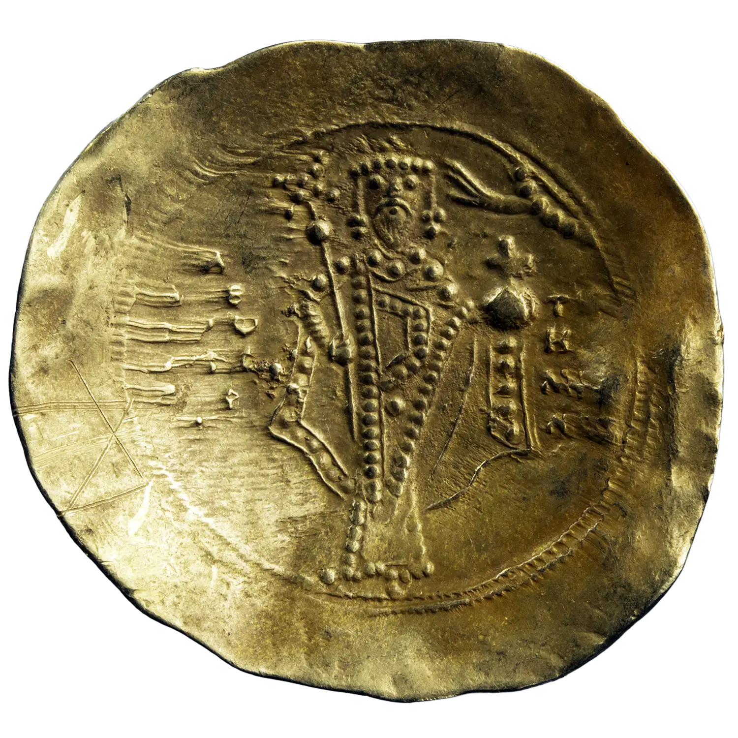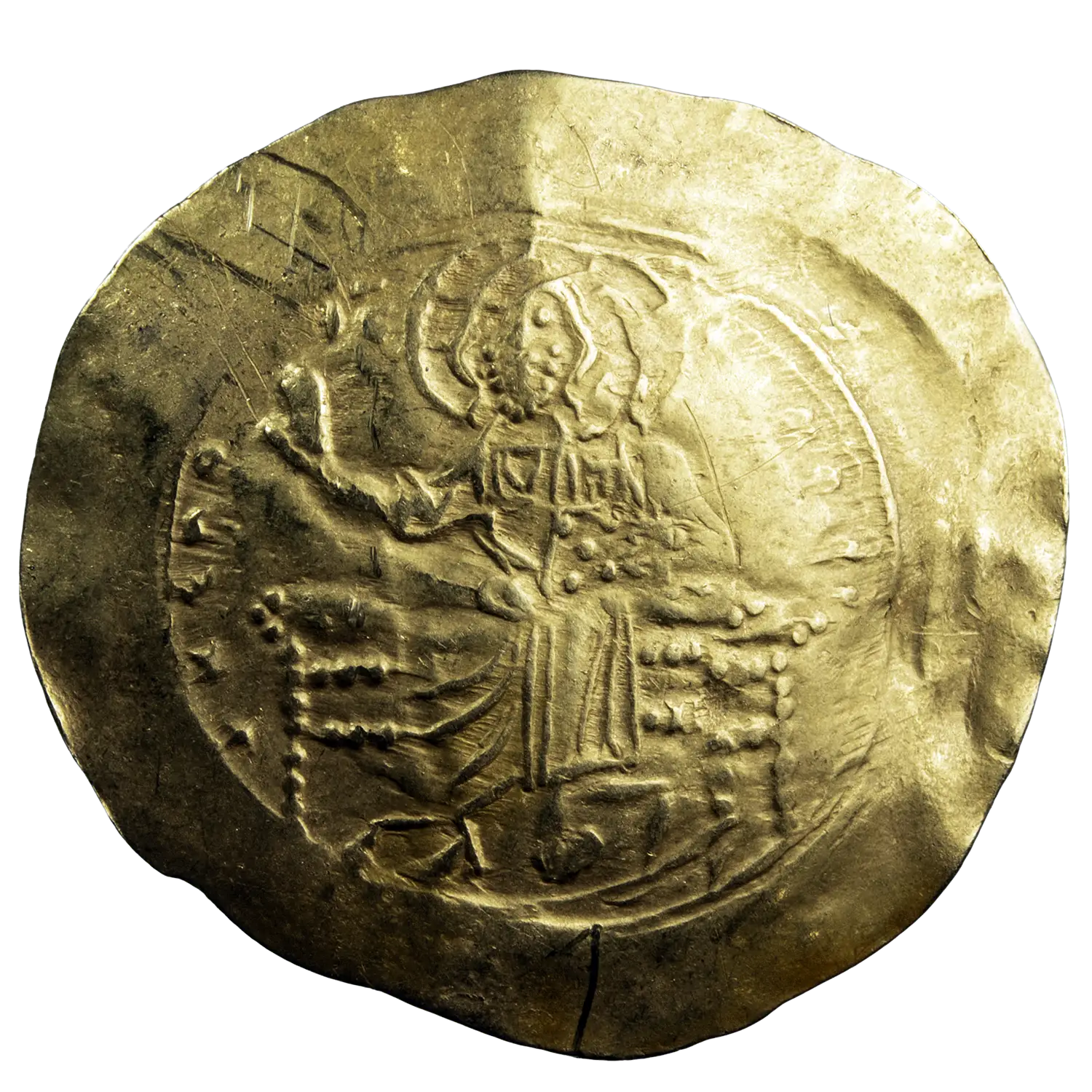 Hyperpyron scyphate of Alexis I Comnenus, Byzantine emperor, minted in 1092-1118 in Constantinople. Christ on a throne on the obverse and Alexis standing frontally on the reverse.