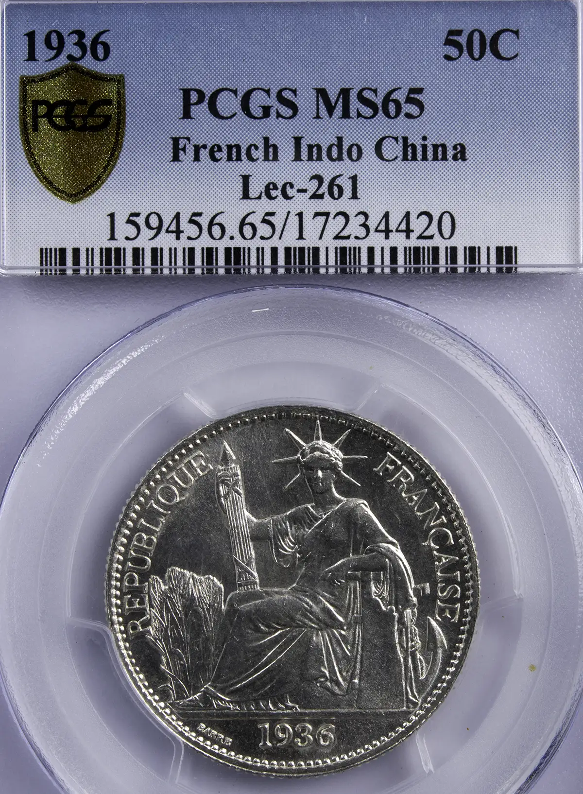 Silver 50-centime coin struck in 1936 for French Indochina, certified by PCGS MS65 (Mint State - Fleur de Coin). Seated French Republic on the obverse