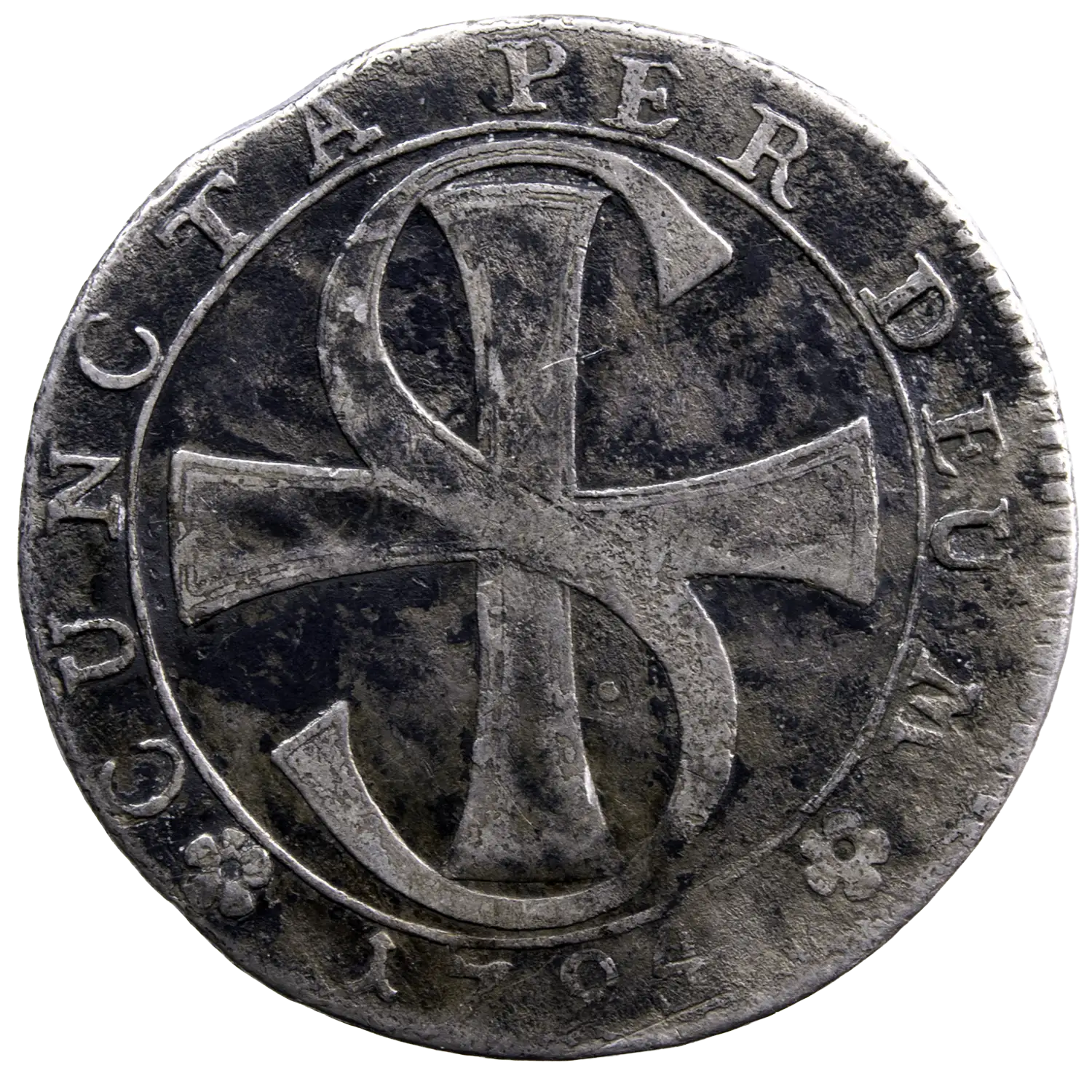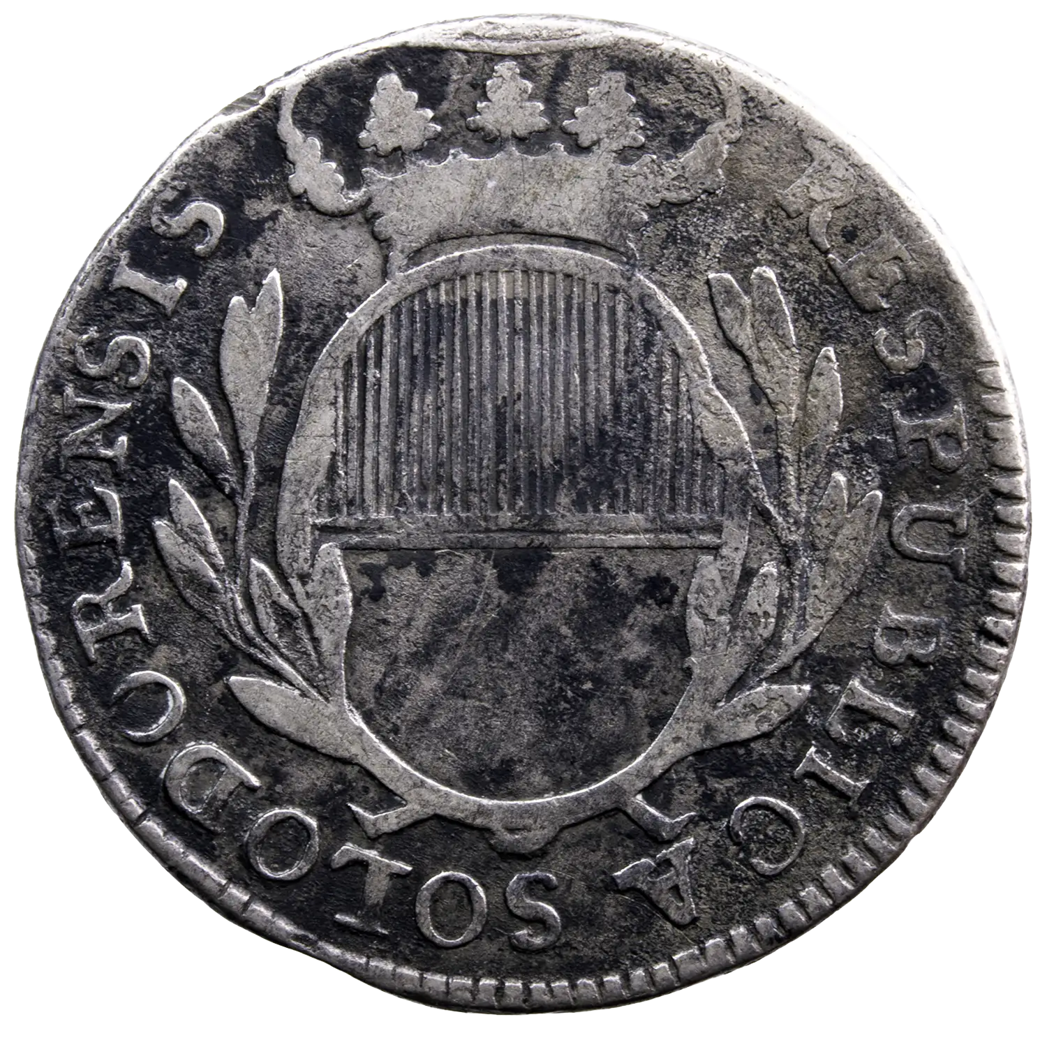 Swiss silver coin from the canton of Solothurn, 10 batzen, 1794, with the cantonal coat of arms on the obverse and an interlaced “S” within a cross on the reverse.