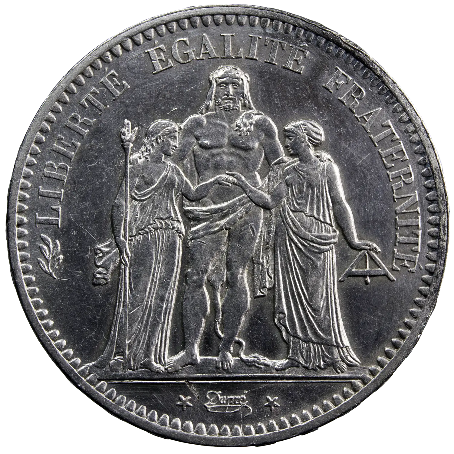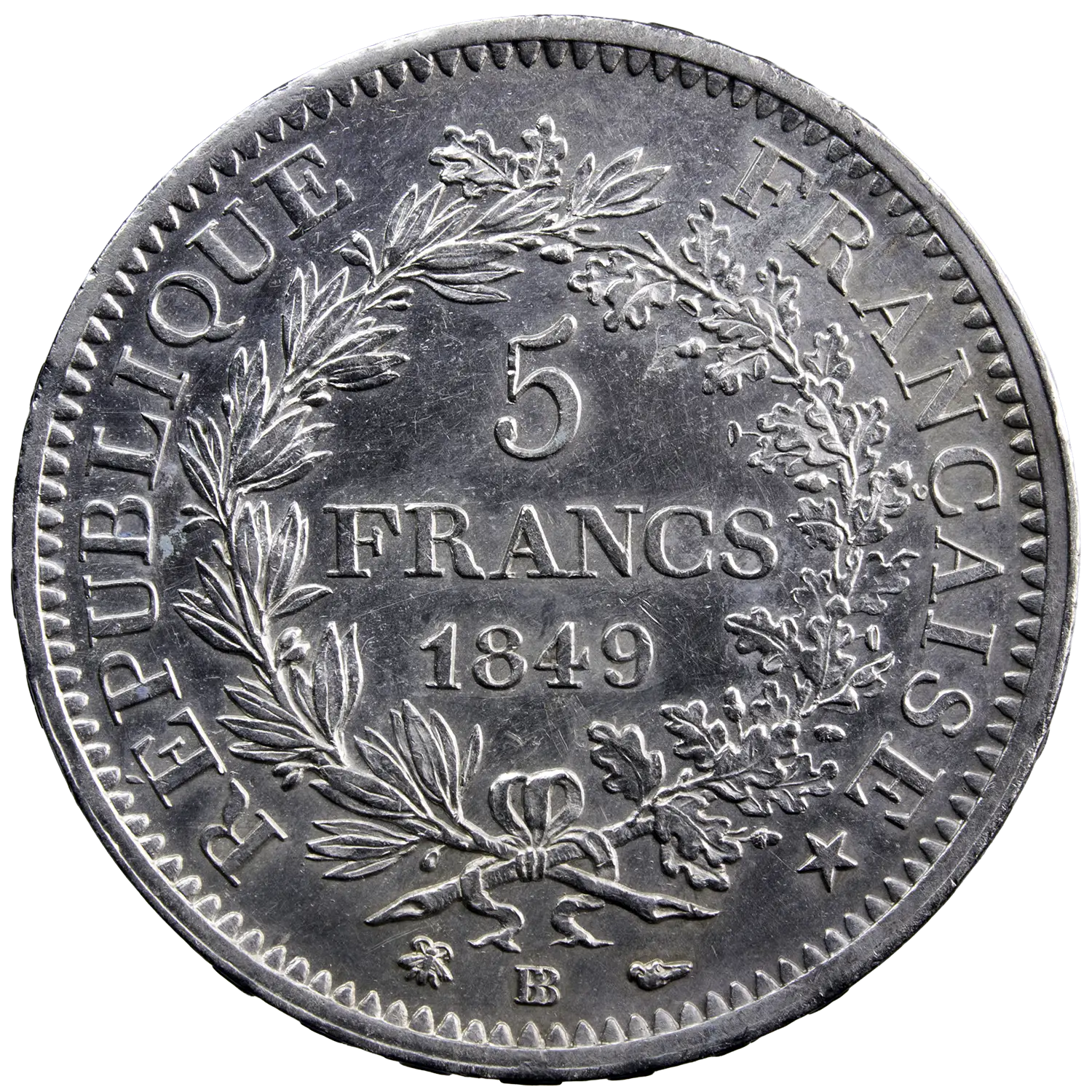 Silver coin of 5 francs Hercule struck during the Second French Republic in 1849 in Strasbourg mint letter BB