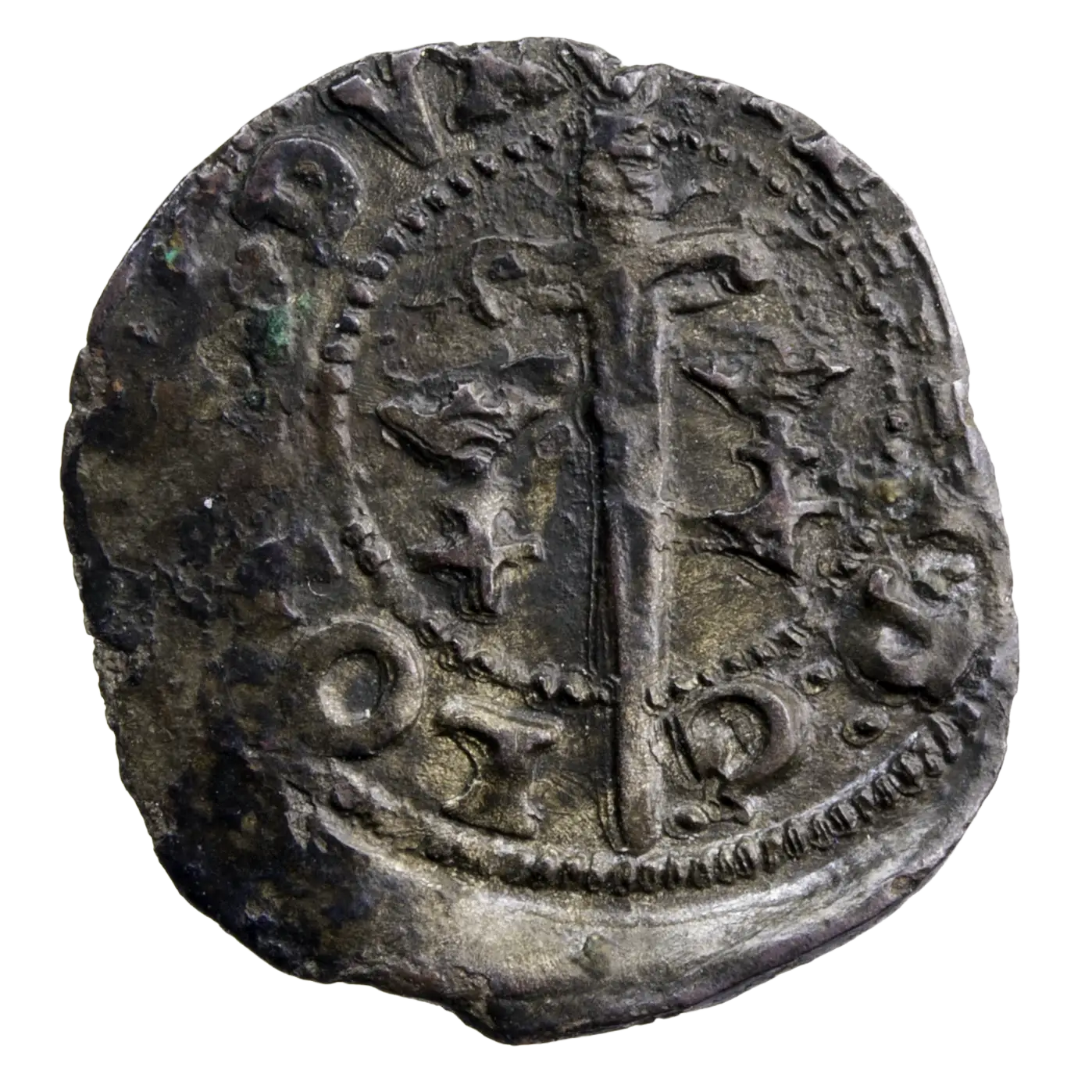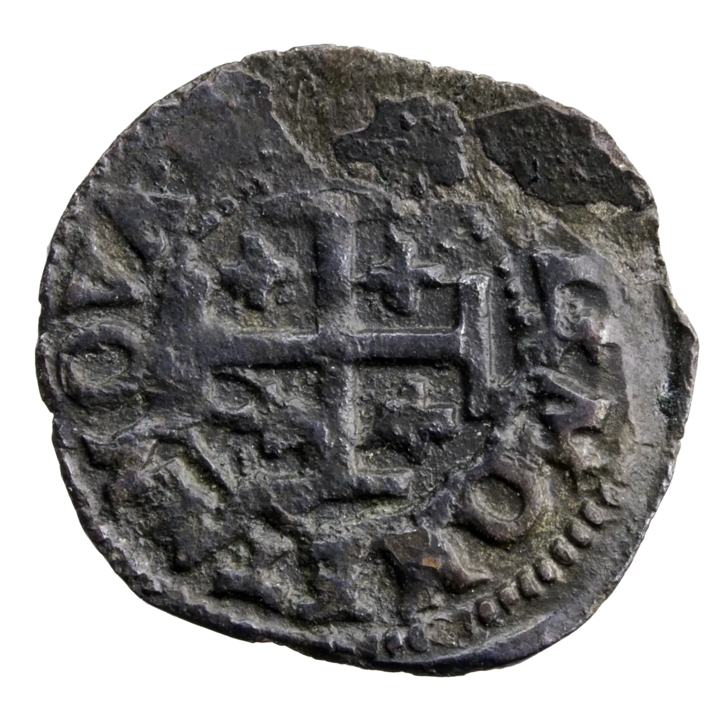 Billon denier of Charles III of Lorraine (1545–1608), coin struck in Nancy. On the obverse, a sword flanked by two Lorraine crosses.