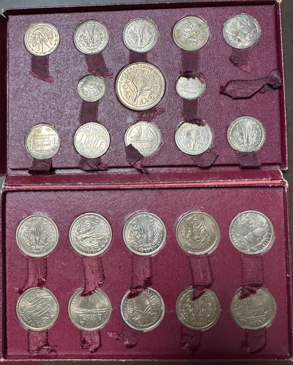 This original box contains two 50 centimes patterns: Oceania and New Caledonia; ten 1 franc patterns: Cameroon, French Equatorial Africa, Togo, French West Africa, Somaliland, Saint Pierre and Miquelon, New Caledonia, Madagascar, Oceania, and Réunion; ten 2 francs coins: Oceania, Réunion, Saint Pierre and Miquelon, Madagascar, New Caledonia, French Equatorial Africa, French West Africa, Cameroon, Togo, and Somaliland; and one 5 francs pattern: Somaliland.