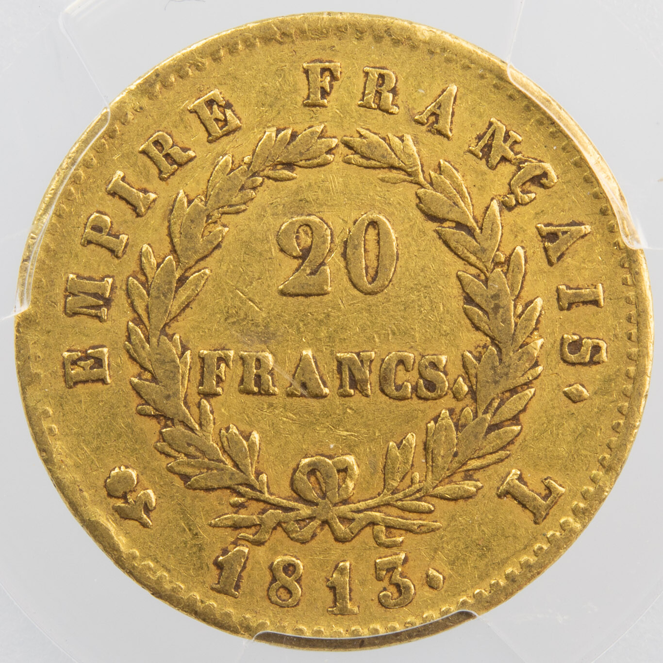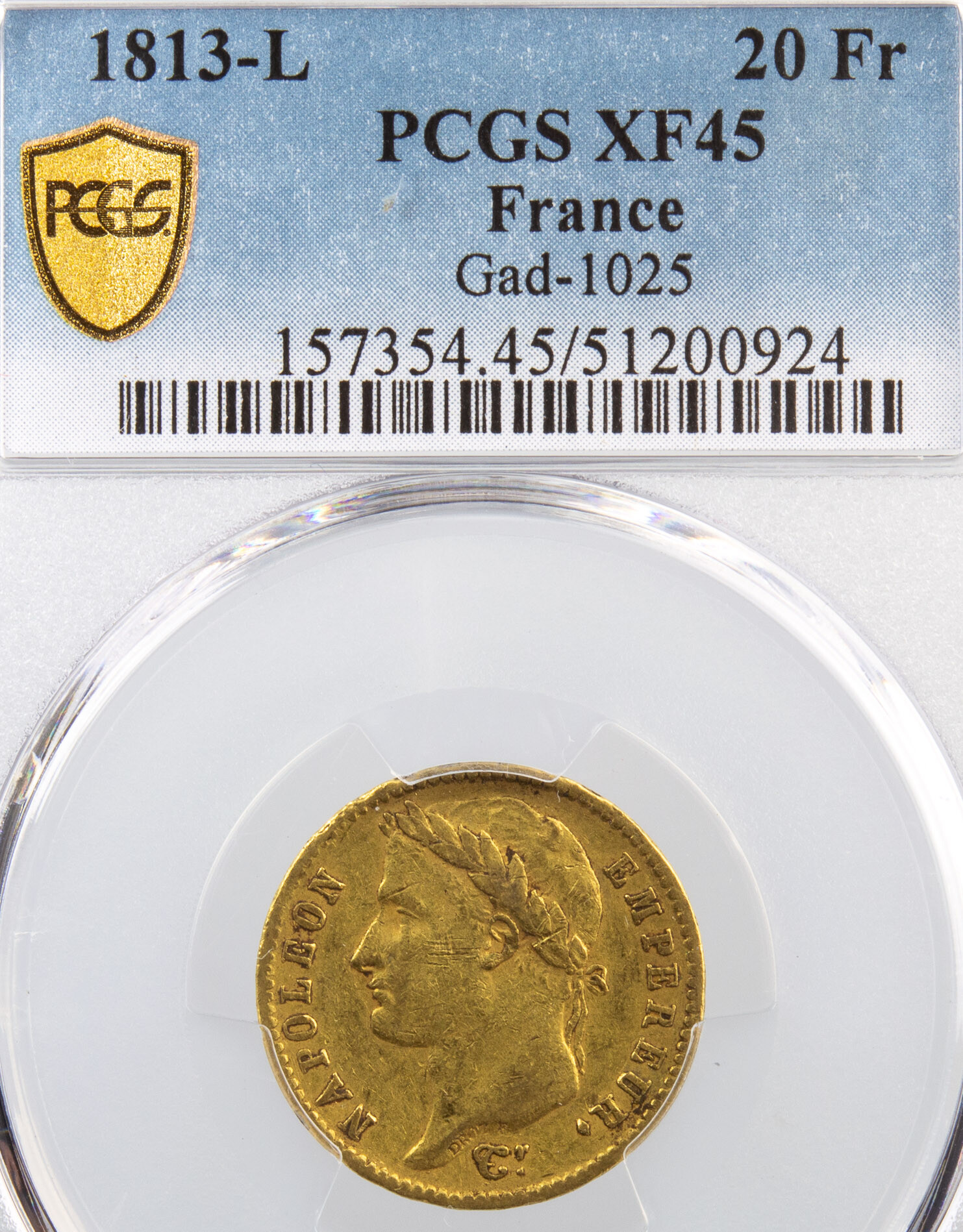 Rare 20-franc gold coin of Napoleon I, minted in 1813 in Bayonne, mint mark ‘L’. Only 19,015 examples were struck. Certified by PCGS XF45.