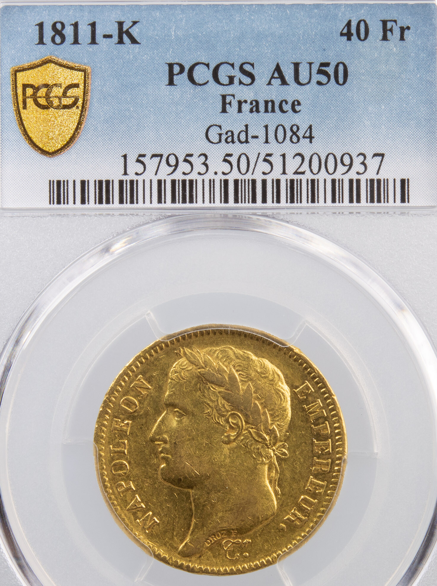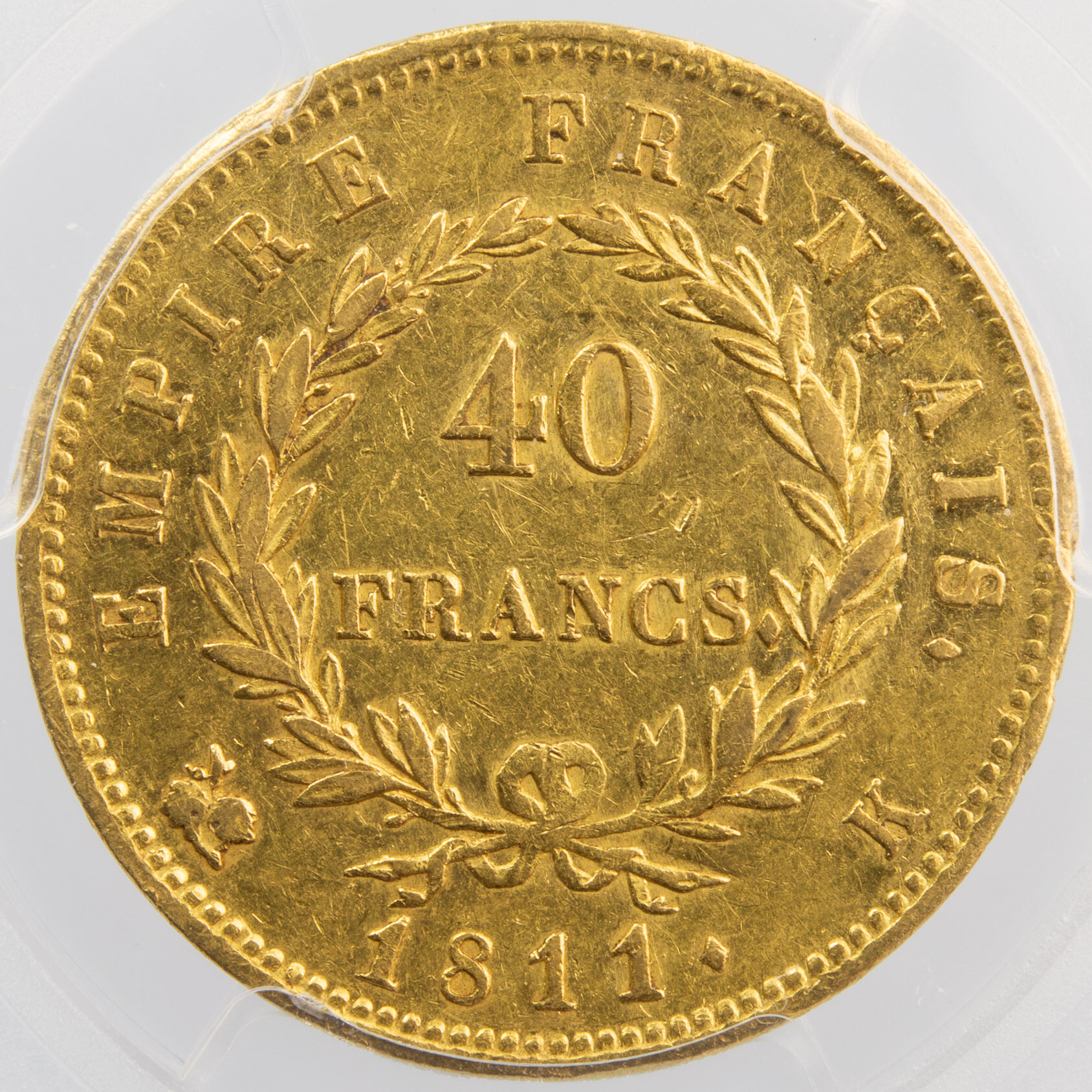 Très rare 40 francs or de Napoléon I, frappée en 1811 à Bordeaux lettre d’atelier K. Seulement 6267 exemplaires frappés. Certifiée par PCGS AU50 (About Uncirculated)
