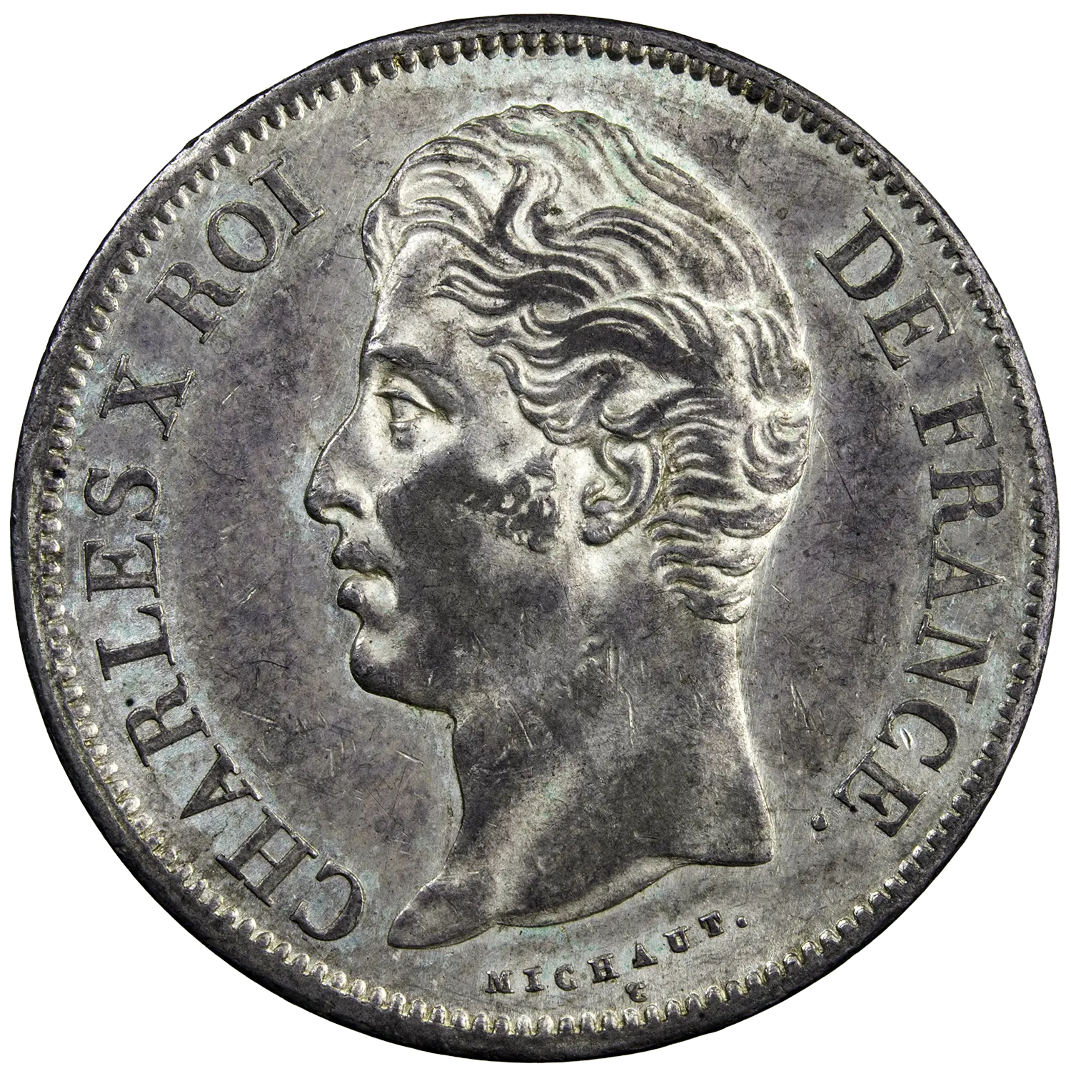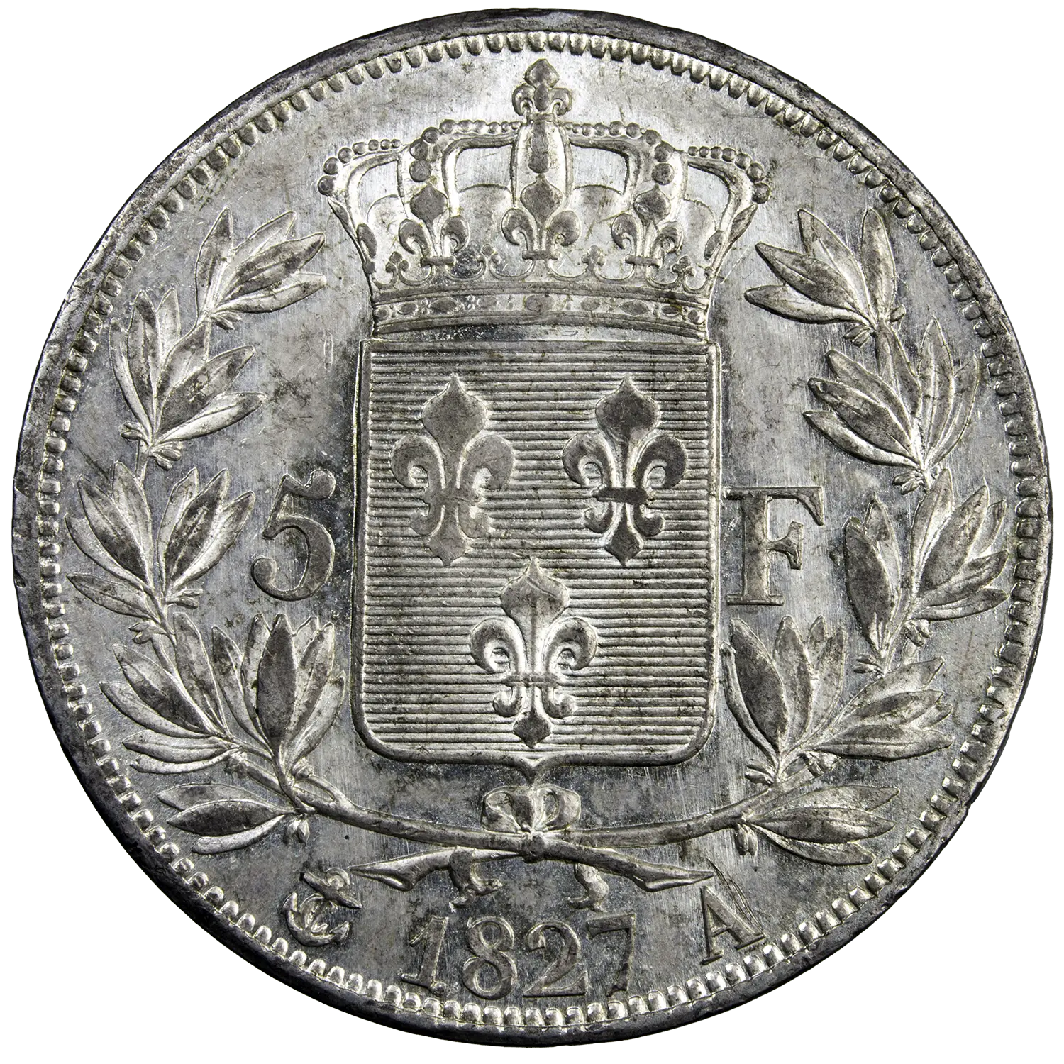 Silver 5 francs of king of France Charles X struck in 1827 in Paris. First year for the second type of the 5 francs Charles X