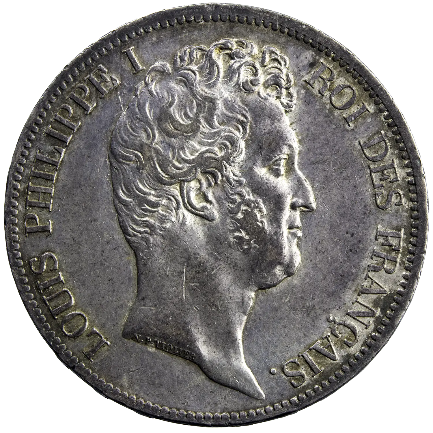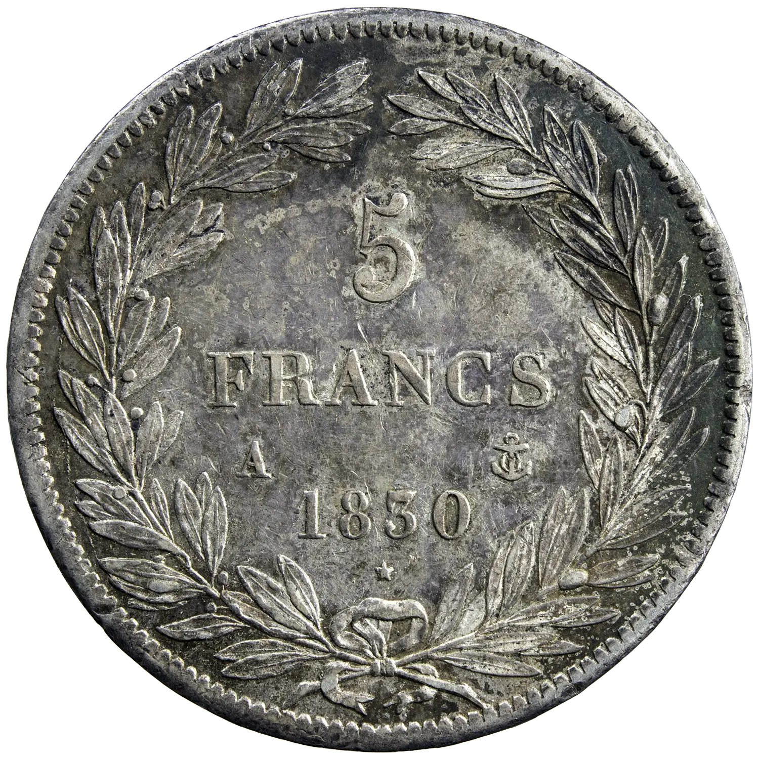 France – Louis Philippe I, 5 Francs 1830, Paris Mint (A). Silver coin, Tiolier type named after the engraver, with raised edge. Attractive example of the early issue of this type