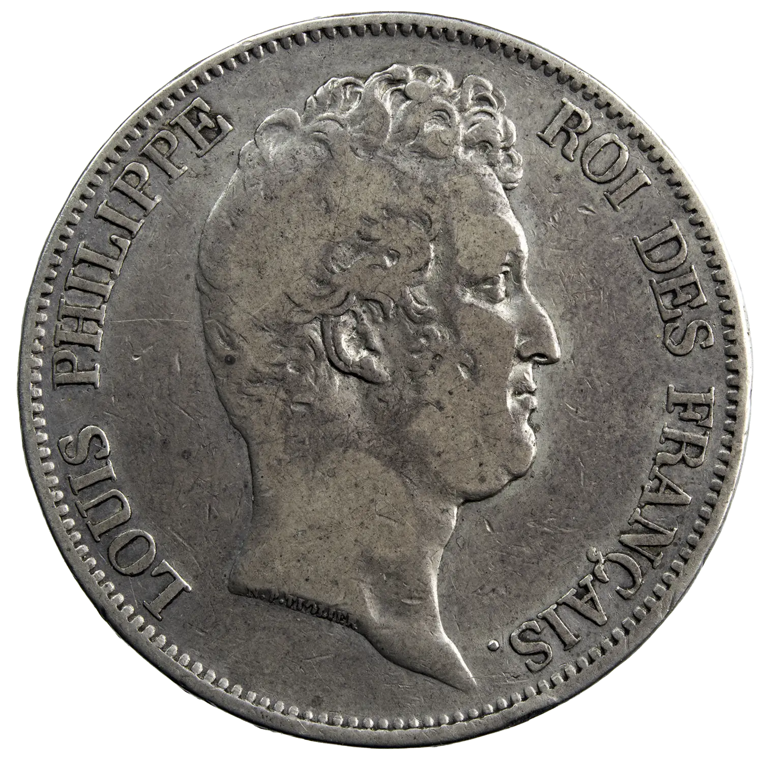 Rare Louis-Philippe 5-franc silver coin, ‘without the I’ variety, with raised-edge inscription. Struck in Paris in 1830