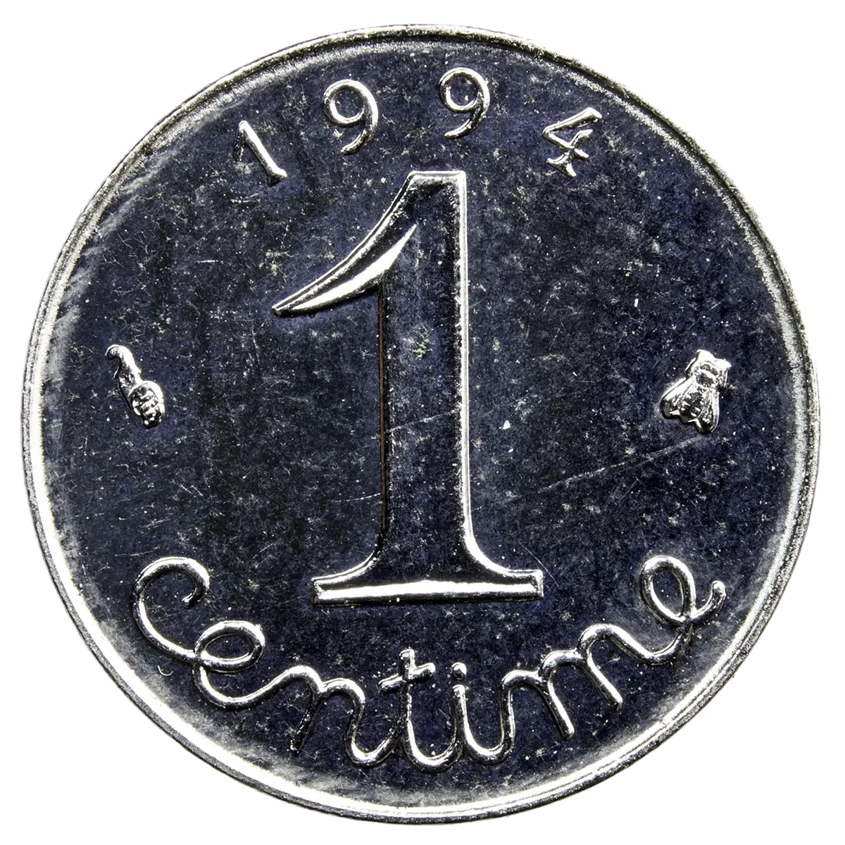 1 centime coin minted in Pessac in stainless steel during the French Fifth Republic. Only 10,000 coins were struck.