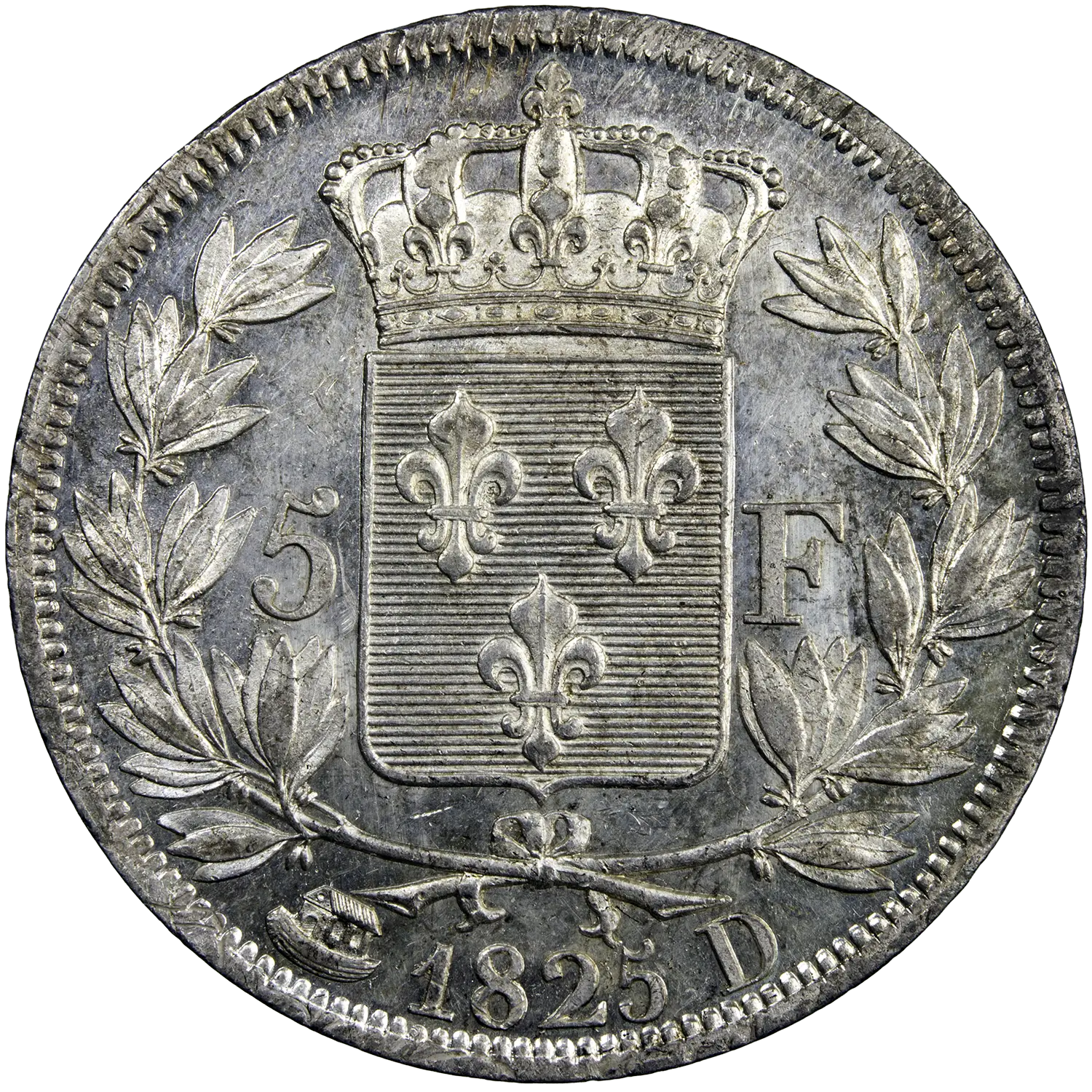 France – Charles X (1824–1830). Silver 5 Francs, 1825, Lyon Mint (D), with Noah’s Ark engraver mark. Superb coin.