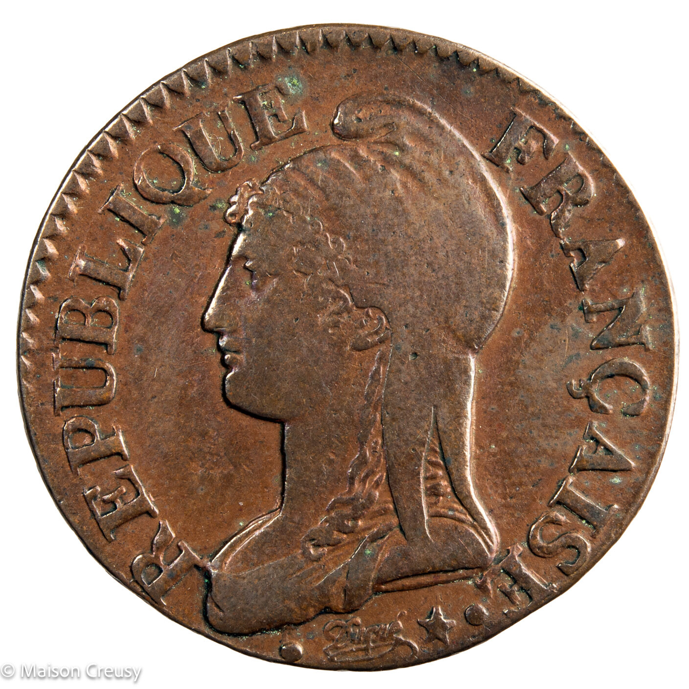 Copper coin struck during the Consulate in Year 9 of the Republic, at Geneva, mintmark G. An interesting mint. Draped bust of Liberty wearing the Phrygian cap.
