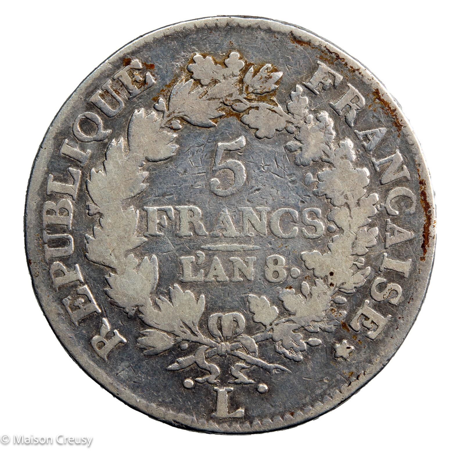 5 Francs “Union et Force” coin, struck during the Directory period in Year 8 (1800/1801) at Bayonne with the mint mark “L”. The obverse features Hercules.