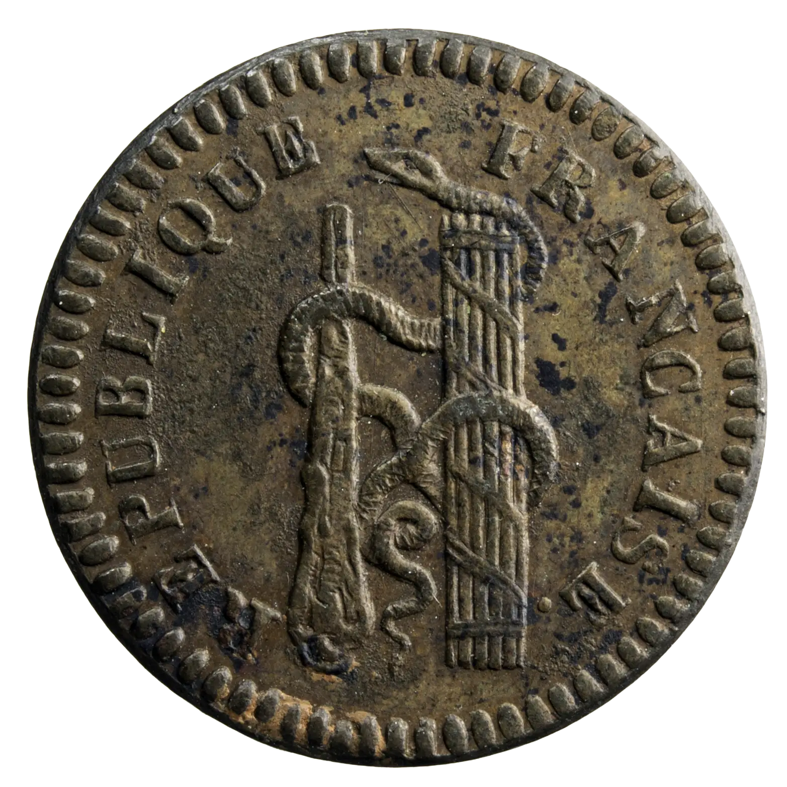 Pattern 10 centimes coin, struck during the Convention in Year 3 (1794/1795) in Paris. On the obverse, a club and a bundle of rods, with a serpent entwined around both