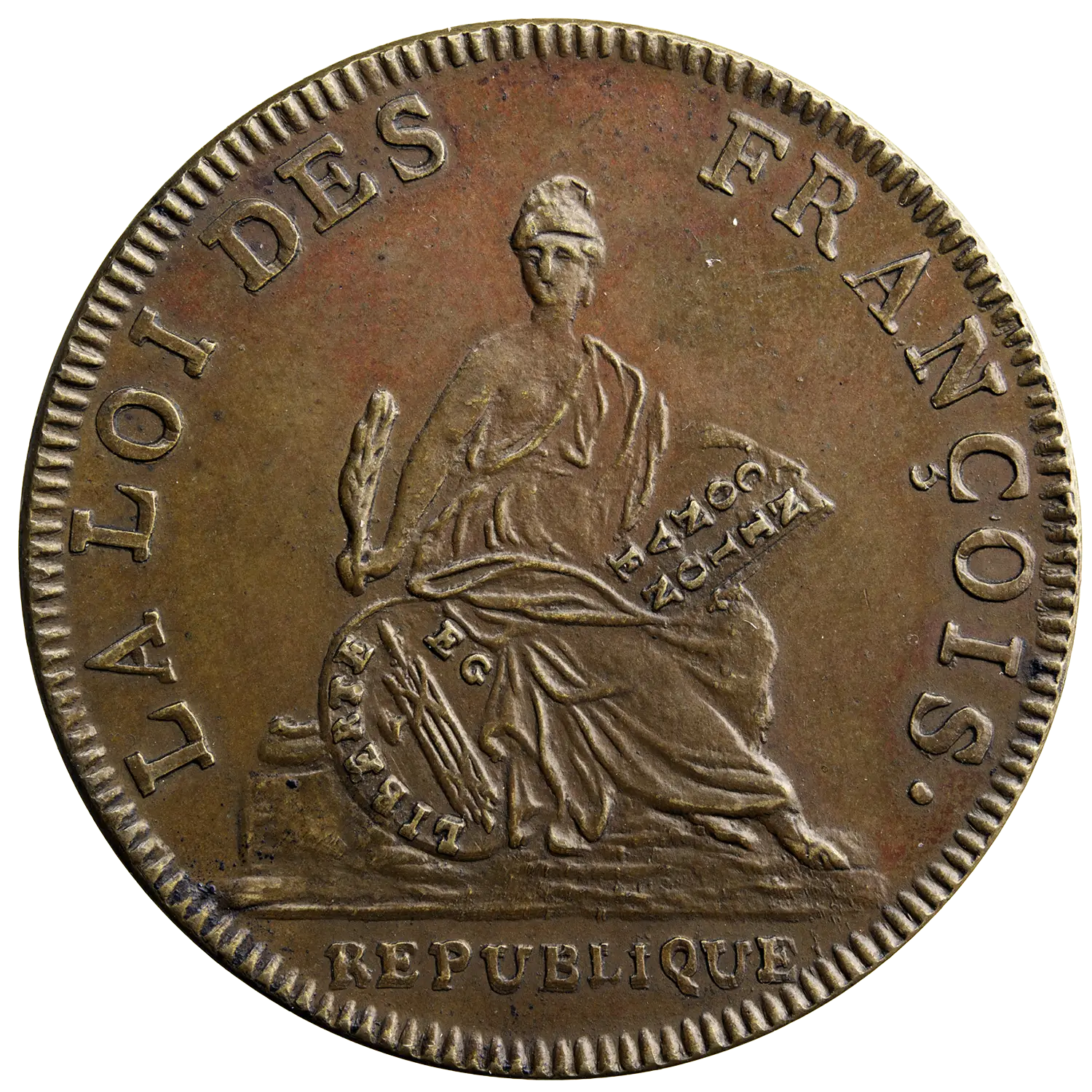 Revolutionary France completely reorganized its monetary system. The aim was to replace the old royal coins with decimal currency, based on the metric system. Jean-Baptiste Bernier, Chief Engraver at the Paris Mint, proposed several trial strikes as part of this reform.