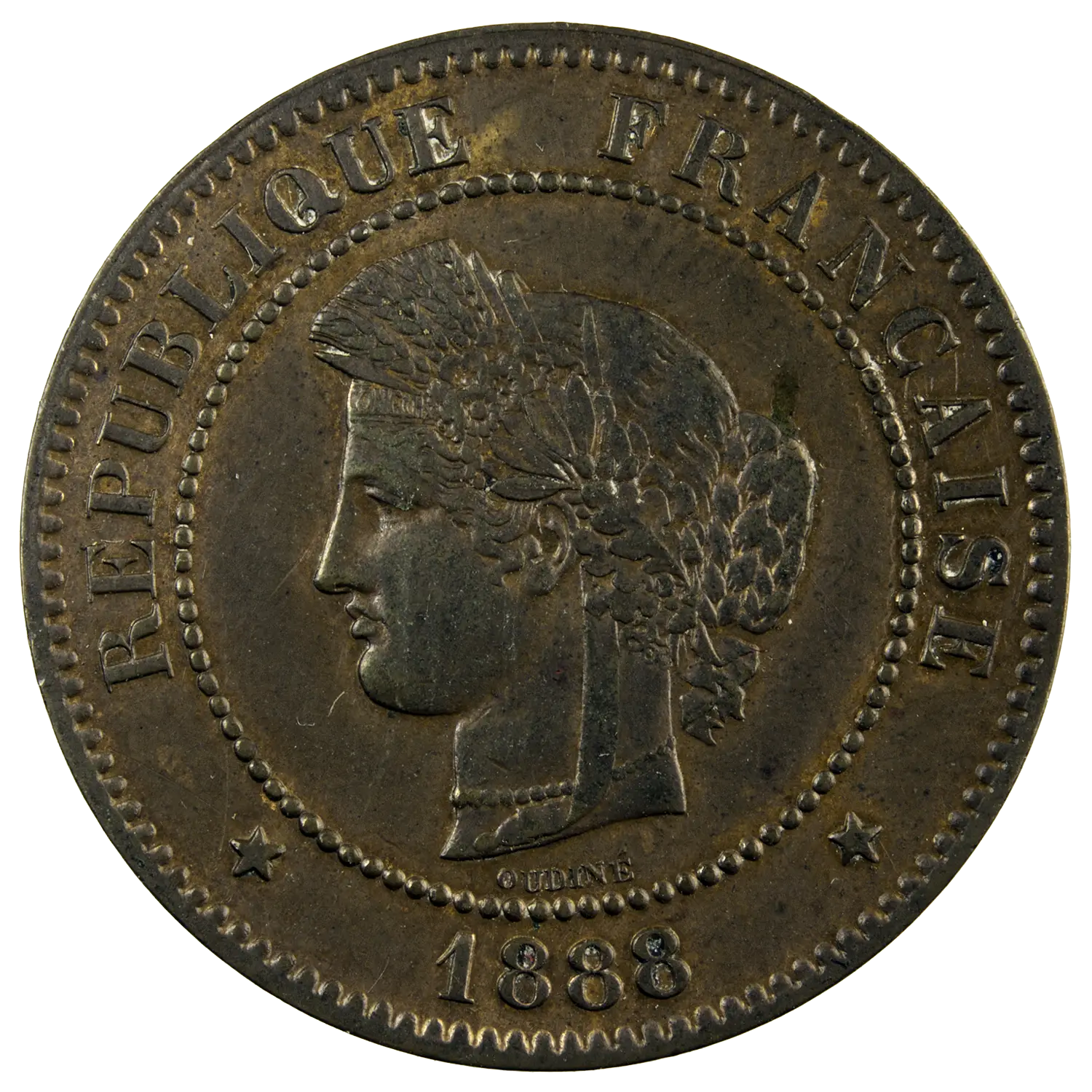 5 centimes coin featuring Ceres, struck in bronze in 1888 in Paris, mint mark A. Obverse engraved by Eugène André Oudiné (1810–1887).