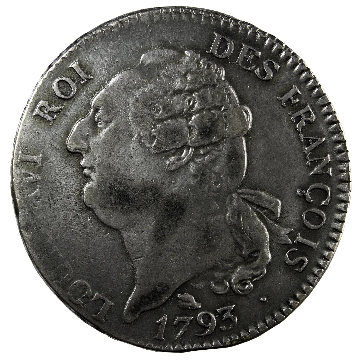Silver 6-livre écu struck during the Constitutional period in Year 5 of Liberty (1793) at the Toulouse mint, mint mark “M.” Obverse features the bust of Louis XVI; reverse depicts an angel writing on the tablets of the law.