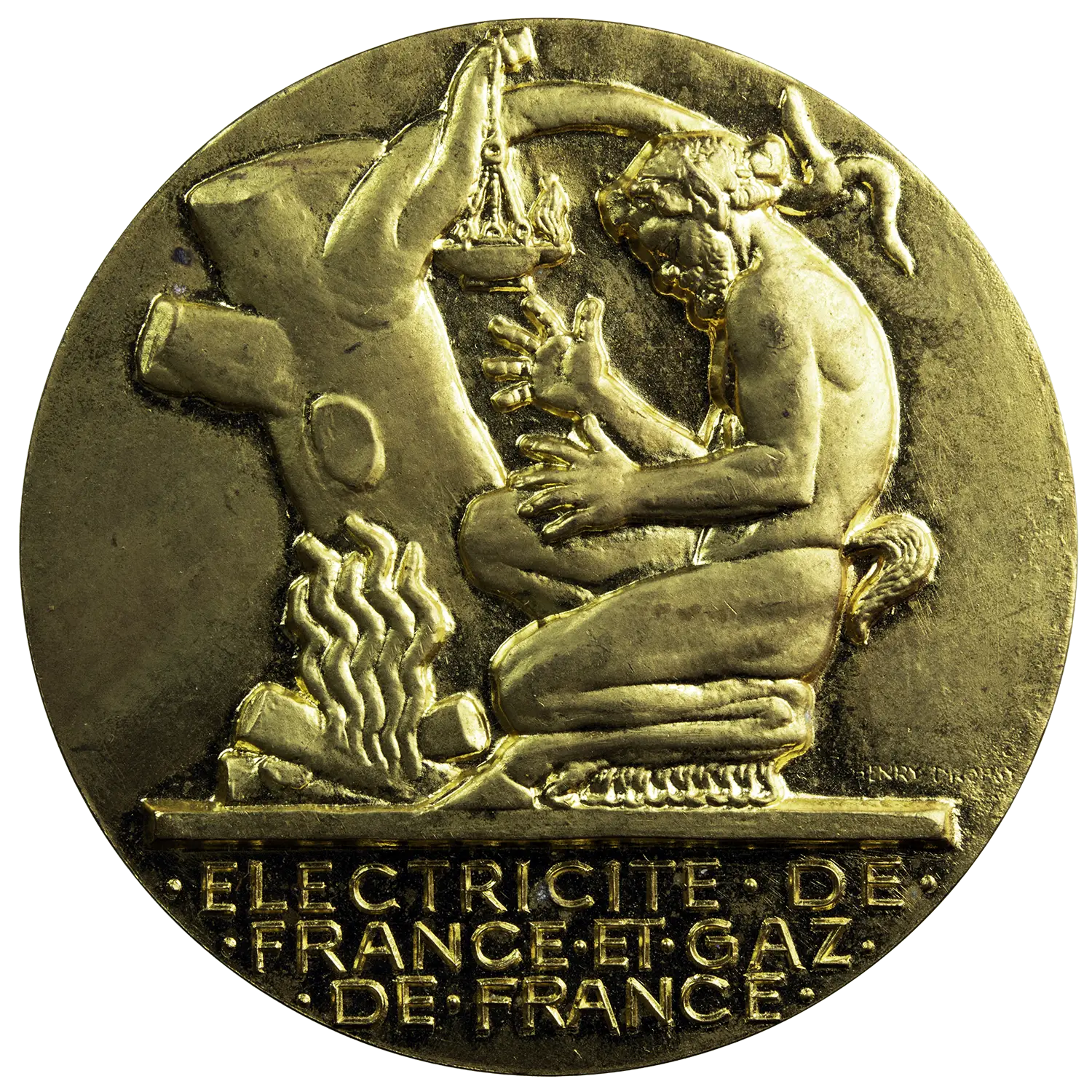 Gilt bronze medal, awarded to R. Baudier for 43 years of service. Obverse: a kneeling satyr beside a fire, with an oil lamp hanging from a tree stump