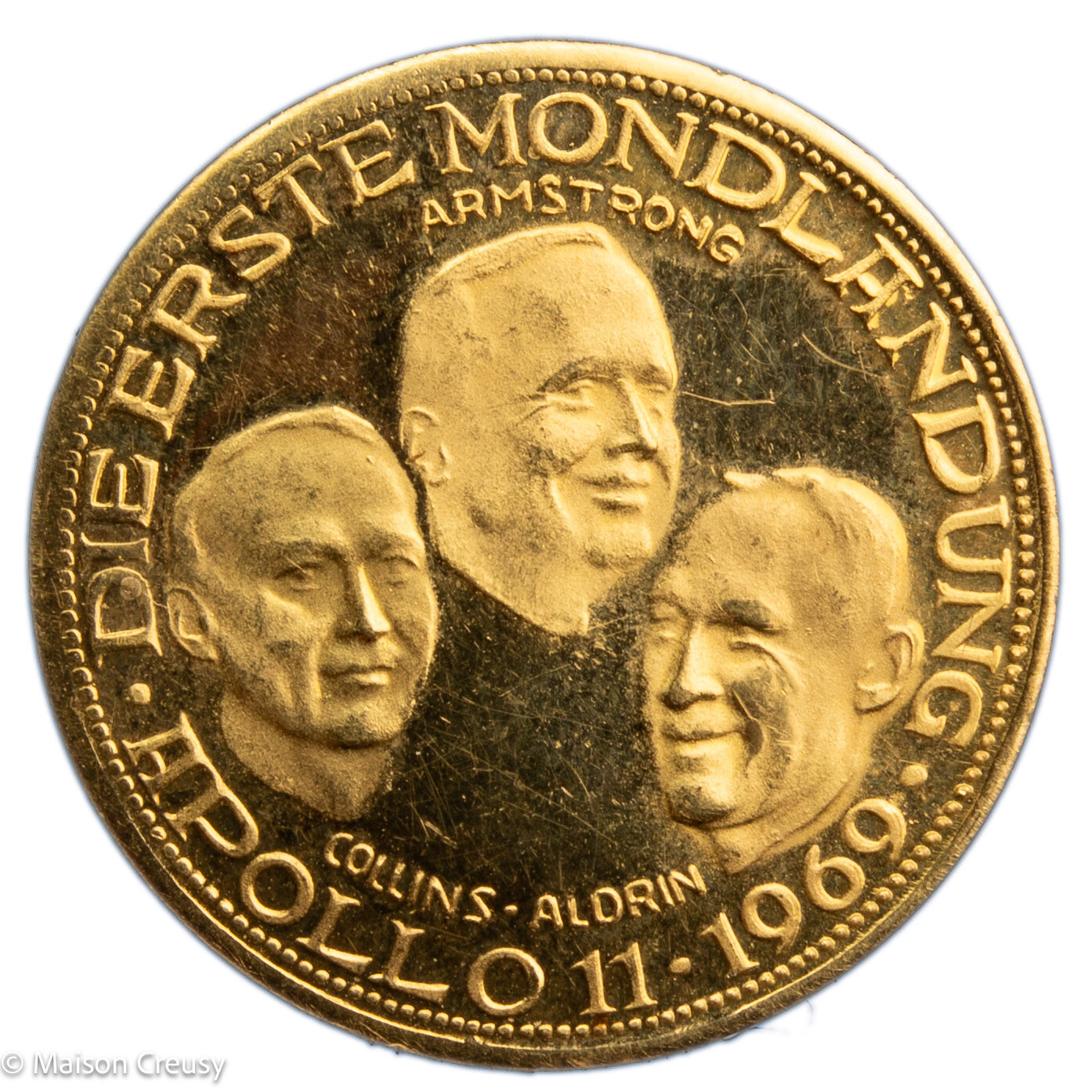 Gold medal (900‰) commemorating the Apollo XI space mission. Armstrong, Collins, and Aldrin on the obverse, Apollo XI’s trajectory on the reverse.