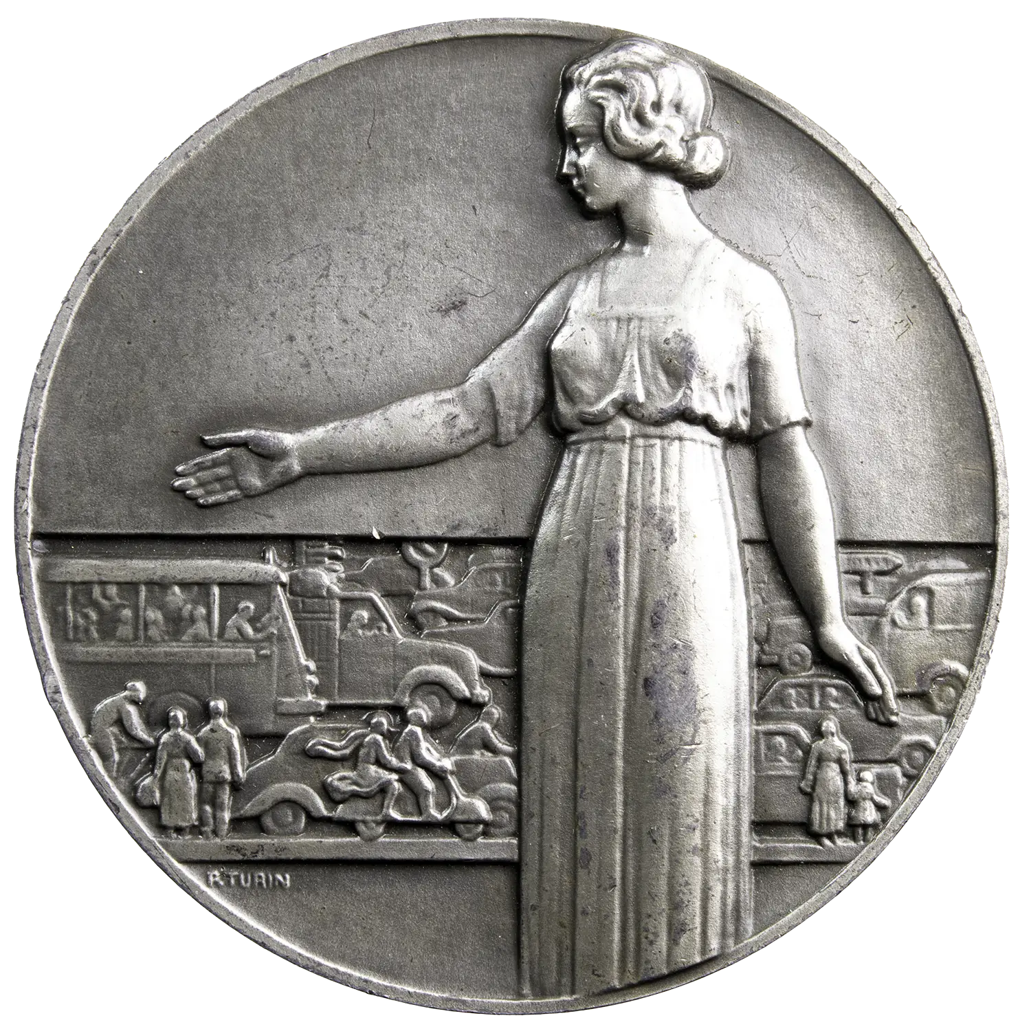 First-grade silver medal (950/1000), 194.5 g, struck with an obverse die by the renowned engraver Pierre Turin (1891–1968) for road safety. Medal awarded to R. Laurent