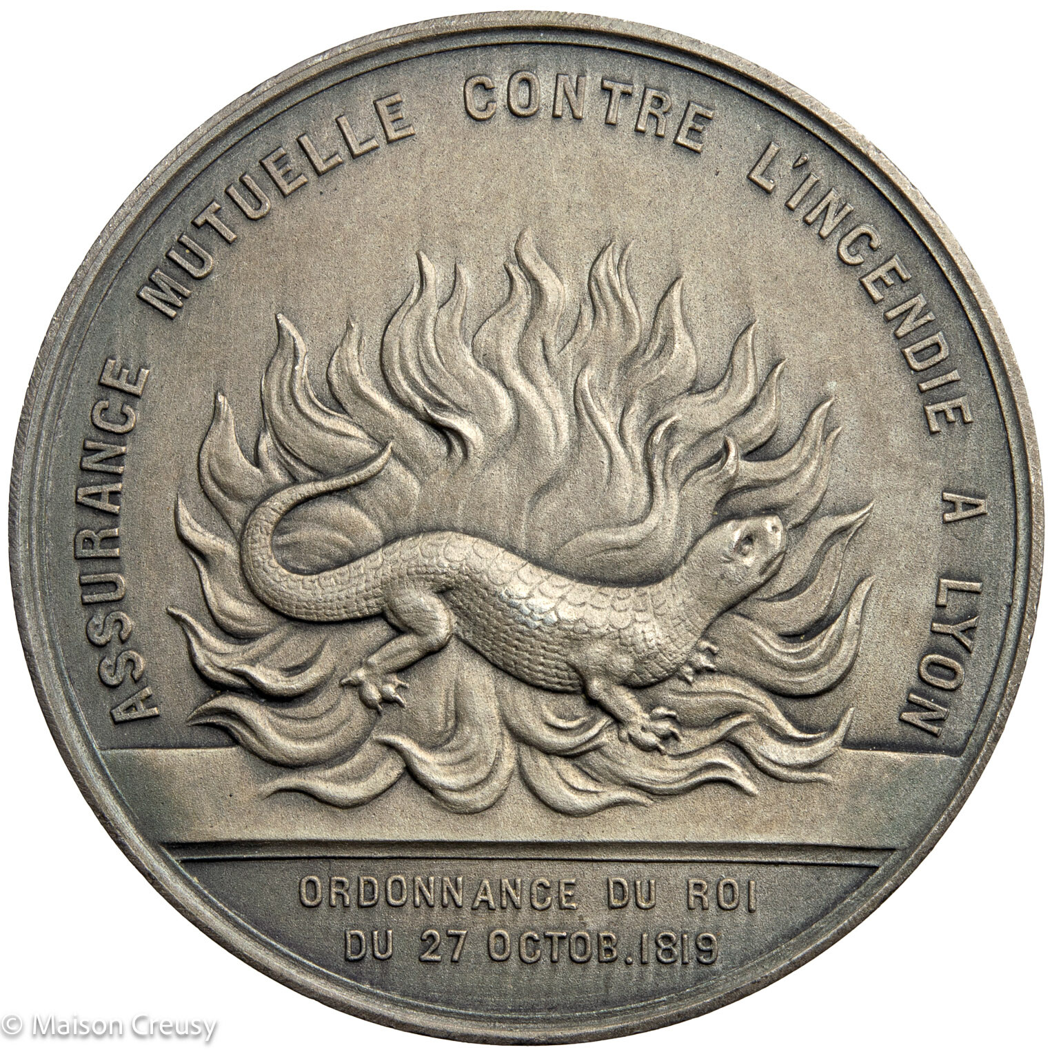 Silver token with matte finish, issued for the mutual fire insurance company in Lyon. Salamander on the reverse.