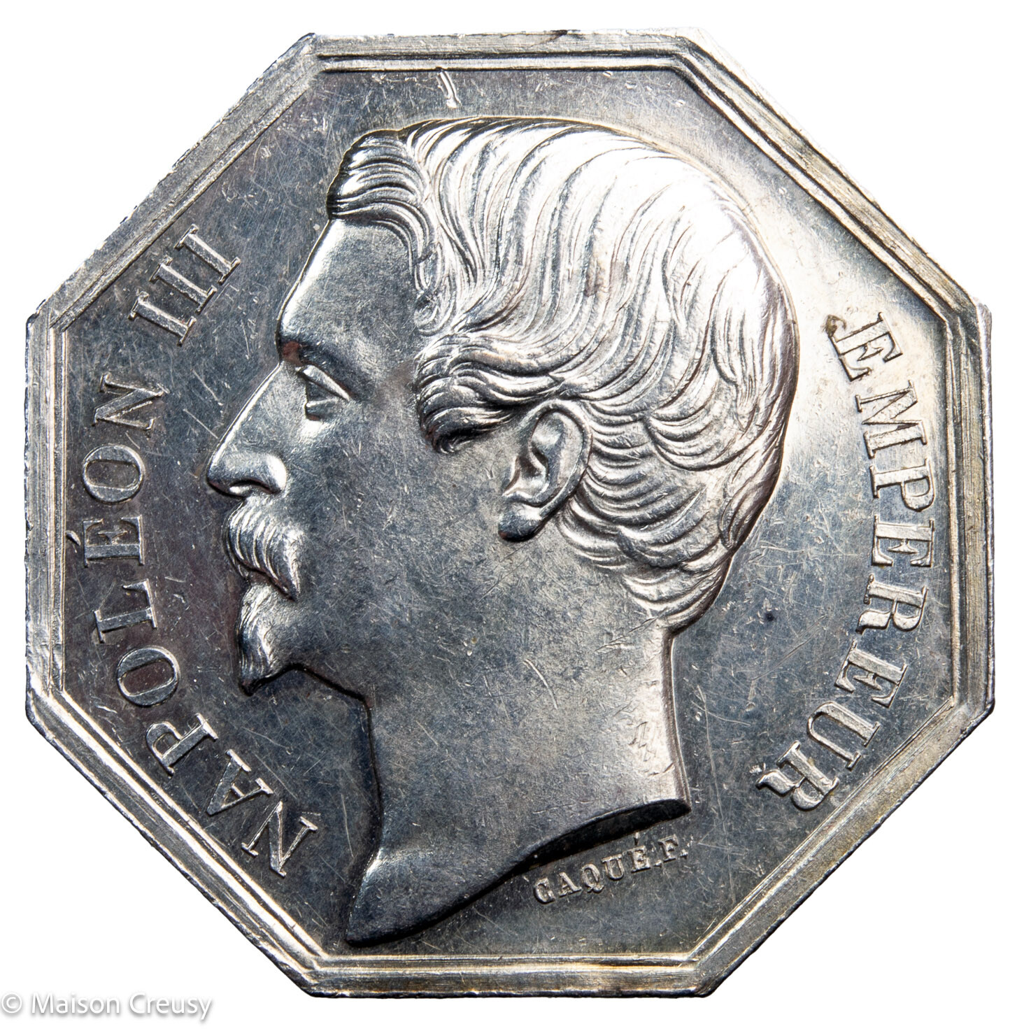 Silver token of Napoleon III minted for the Chamber of Commerce of Bordeaux. Hallmark “hand” SILVER on the edge. Ship’s bow on the reverse.