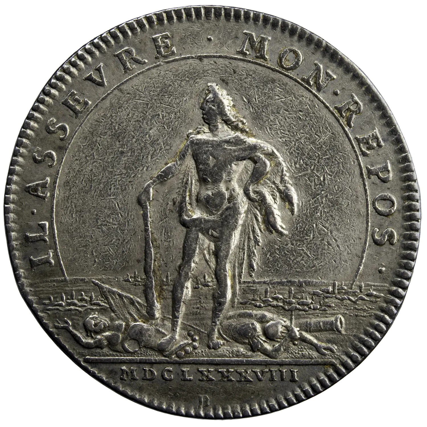 Silver jeton of the Estates of Burgundy, struck in 1688. Louis XIV depicted as Hercules standing on a battlefield.
