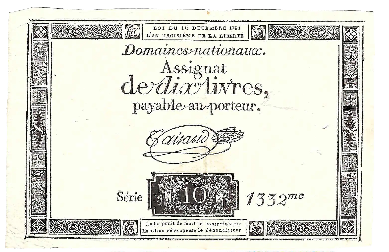 10-livre assignat, issued on 16 December 1791 during the French Revolution.