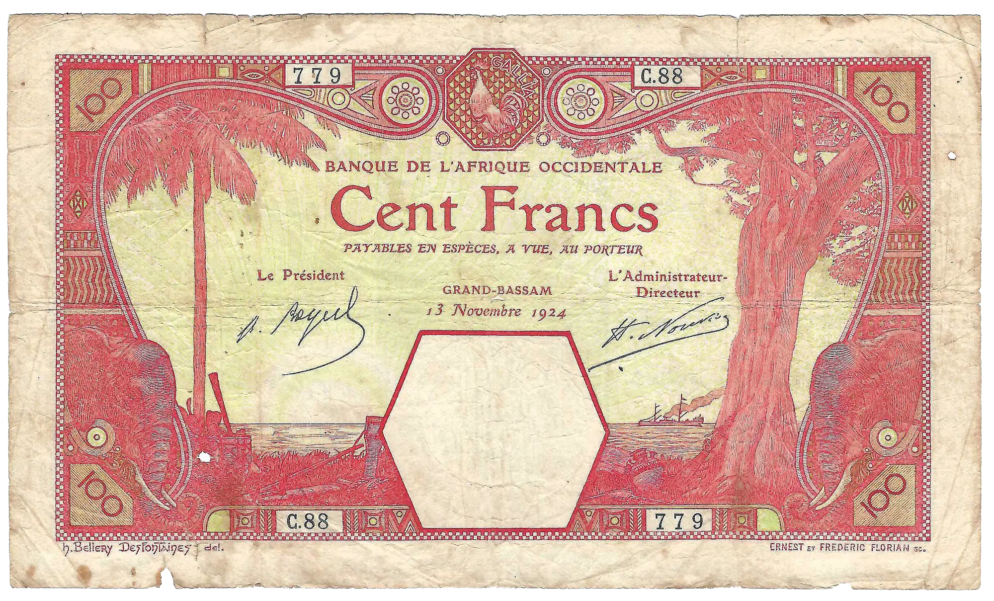 Banknote of French West Africa for Grand-Bassam, printed on November 13, 1924, alphabet C.88 number 779