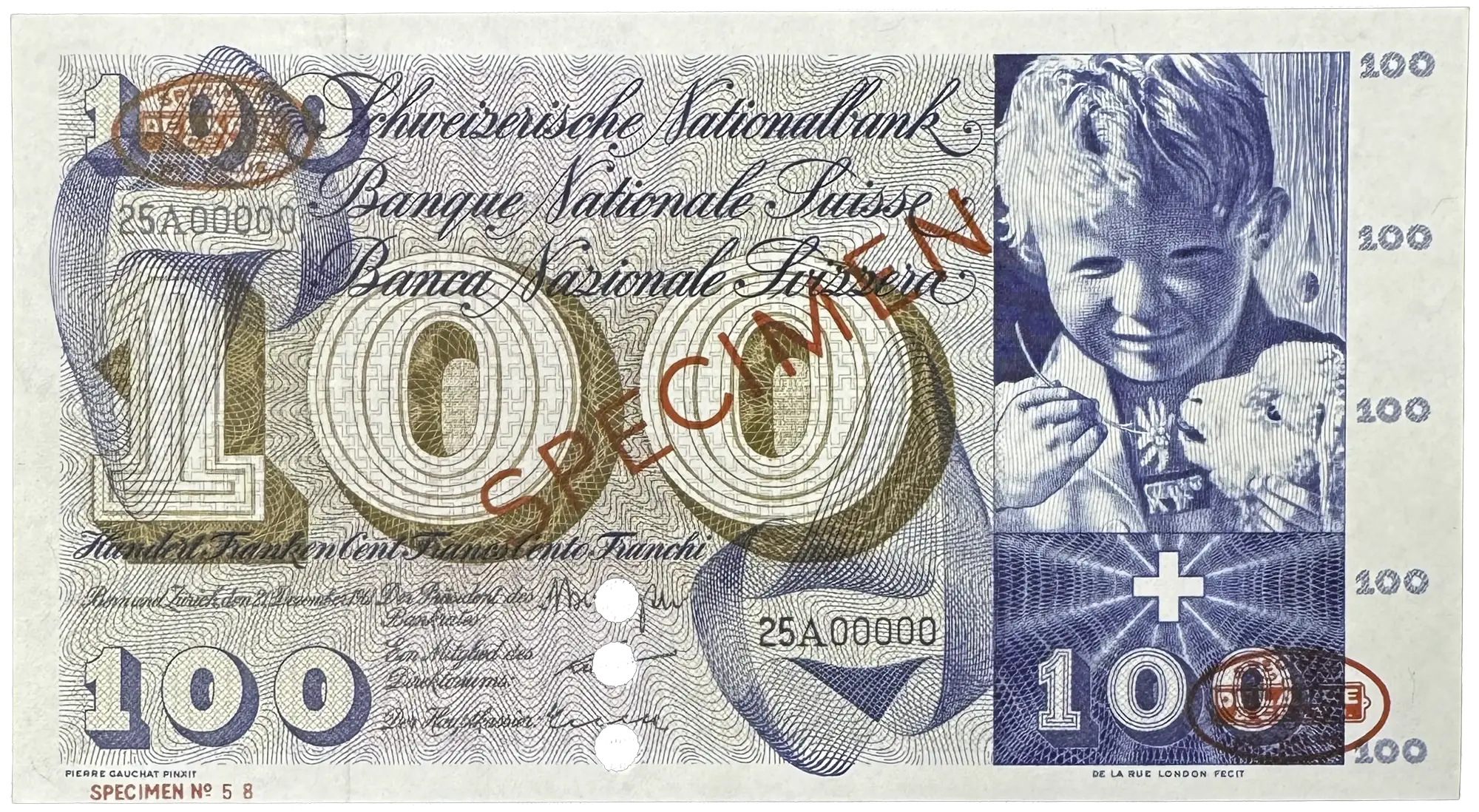 Specimen 100-franc banknote of the Swiss National Bank dated 21 December 1961 / serial 25A00000 / Specimen No. 58. Three perforation holes