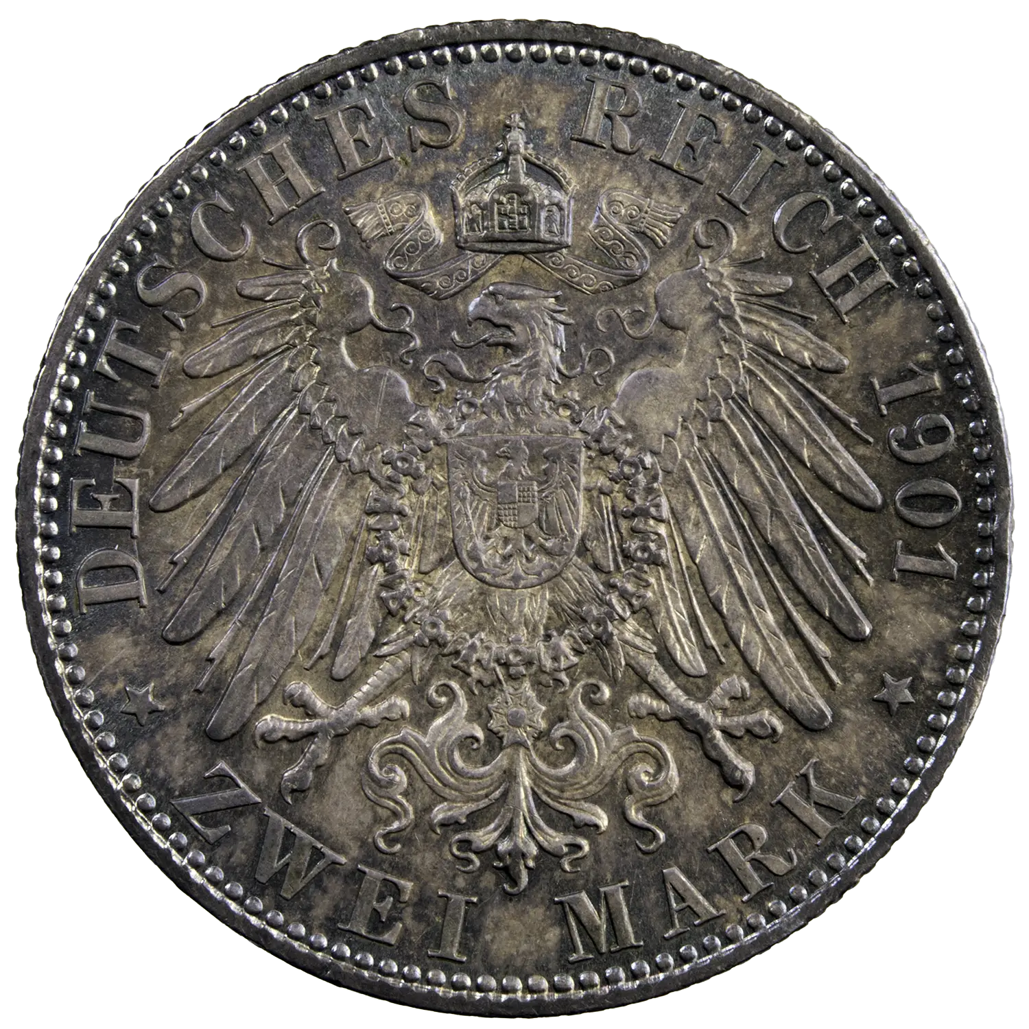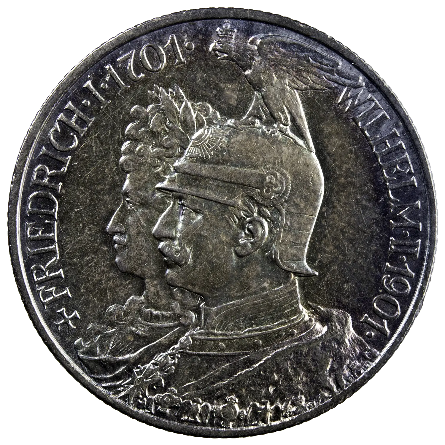 Silver 2-mark coin struck in 1901 in Berlin to commemorate the 200th anniversary of the Kingdom of Prussia. Features the busts of Frederick I and Wilhelm II.