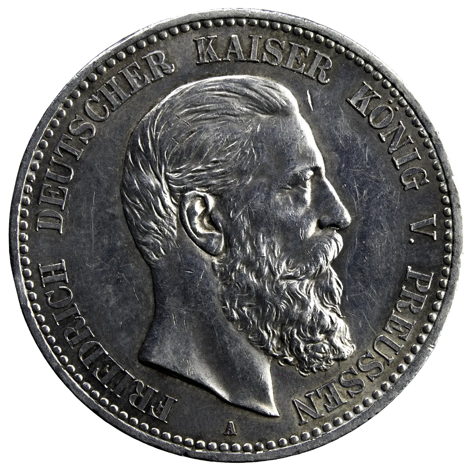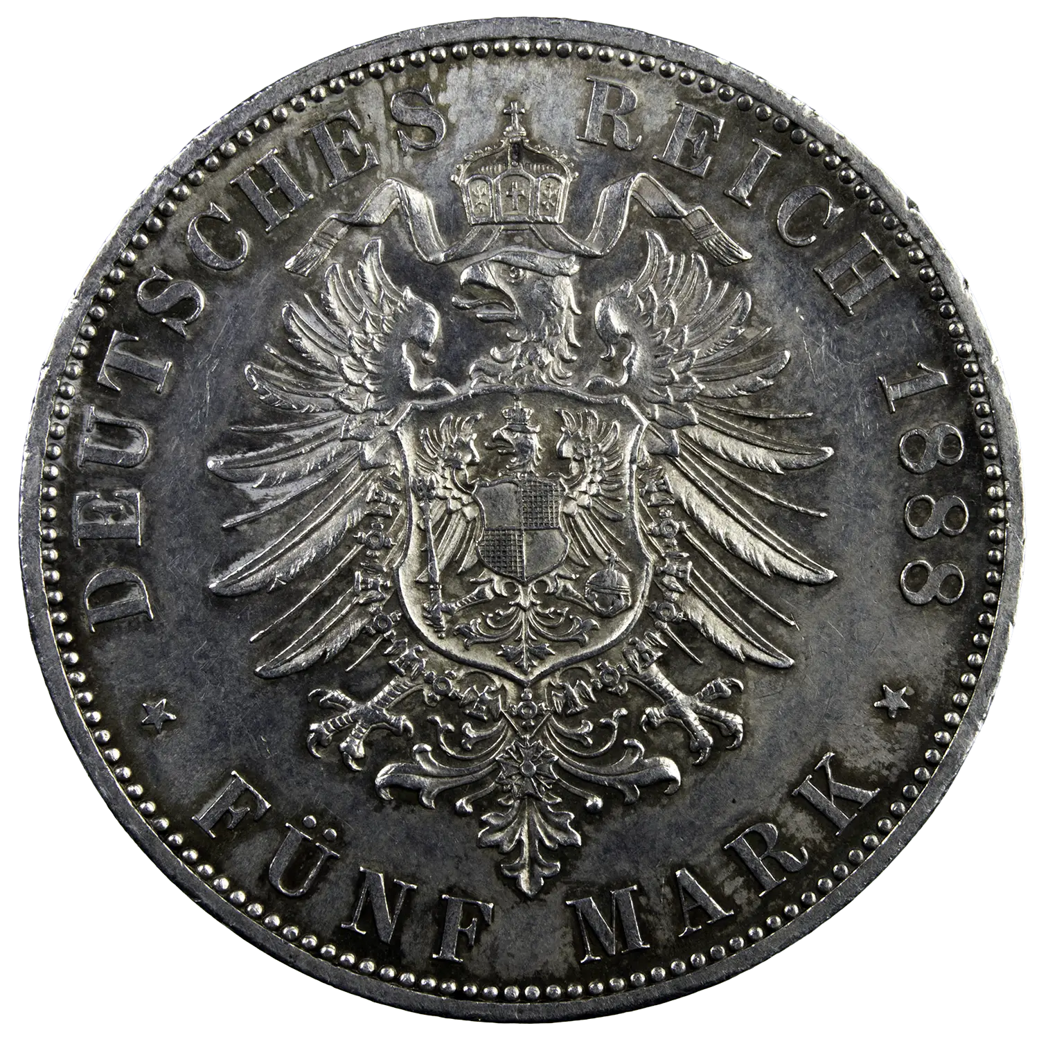 1888 silver 5-mark coin struck under Frederick III of Prussia. Obverse features the bust of Friedrich III, reverse shows the imperial eagle