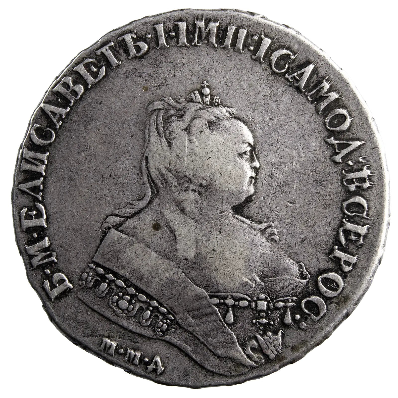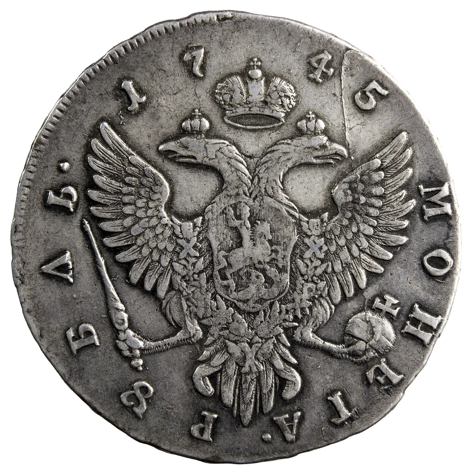 Silver rouble of Empress Elizabeth of Russia. Coin struck in 1745 in Moscow (ММД), obverse with bust of Elizabeth facing right, reverse with imperial eagle.
