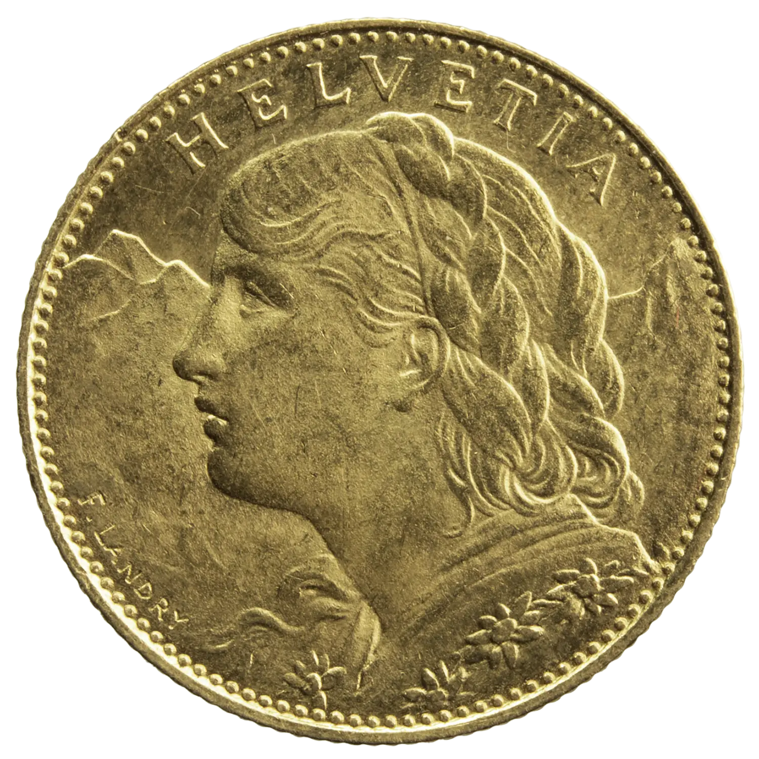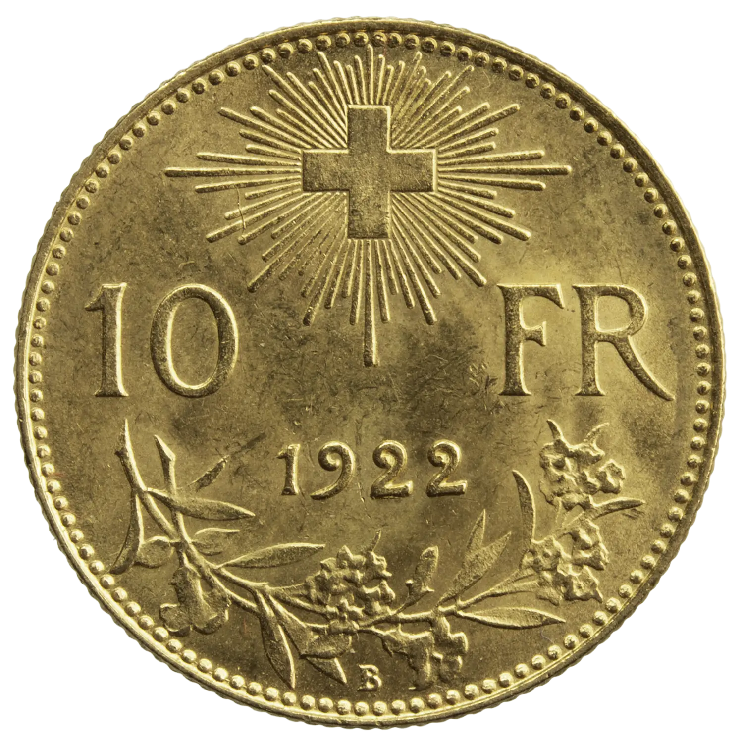 Superbe pièce de 10 francs or Suisse frappée en 1922 à Berne. 1’020’000 exemplaires frappés. HELVETIA la tête à gauche à l’avers
